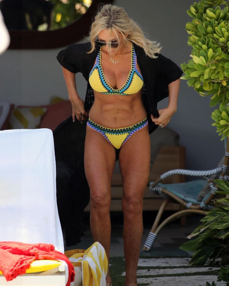 A actriz Ă© outra mulher madura que ficou deslumbrante num biquĂni Ă s riscas pretas, azuis e brancas enquanto estava na praia. A ex-participante de Real Housewives of Beverly Hills sempre se diverte muito, especialmente enquanto toma sol em seus trajes de banho elegantes.