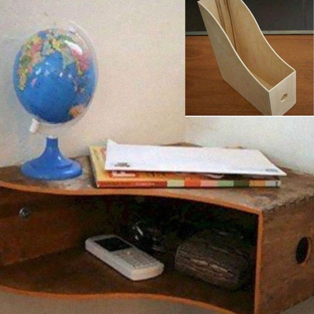 Taking two small shelves and mounting them on top of each other with the tips facing each other is what makes up this ingenious hack.