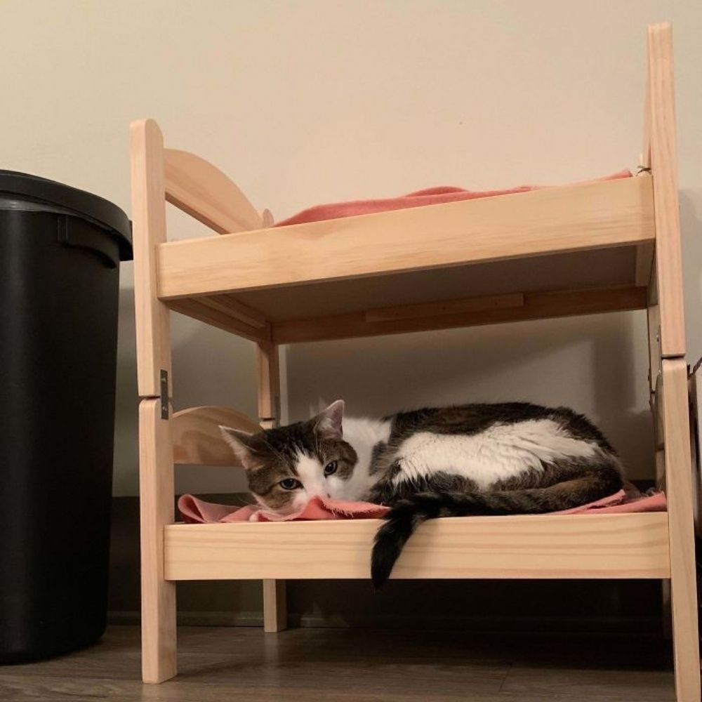 This cat owner wanted to give her furry friend a place in which he had room to have a friend over. So, the owner took two Duktig Doll Beds and bolted them together to make this kitty bunk bed.