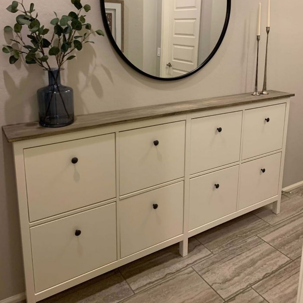 Taking two Hemnes Shoe Cabinets and combining them together under one stained wood top makes for a beautiful introduction to your home. The process was easy and only took a bit of time to create this stunning piece.