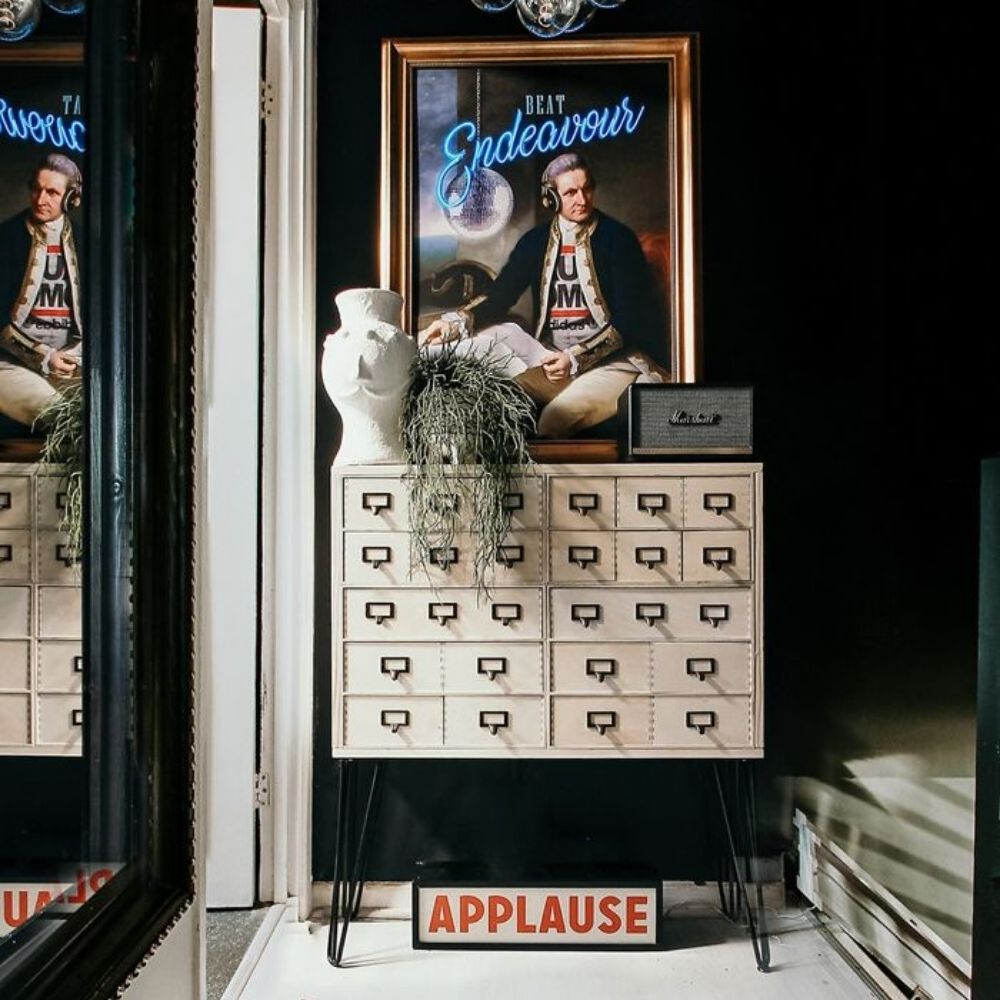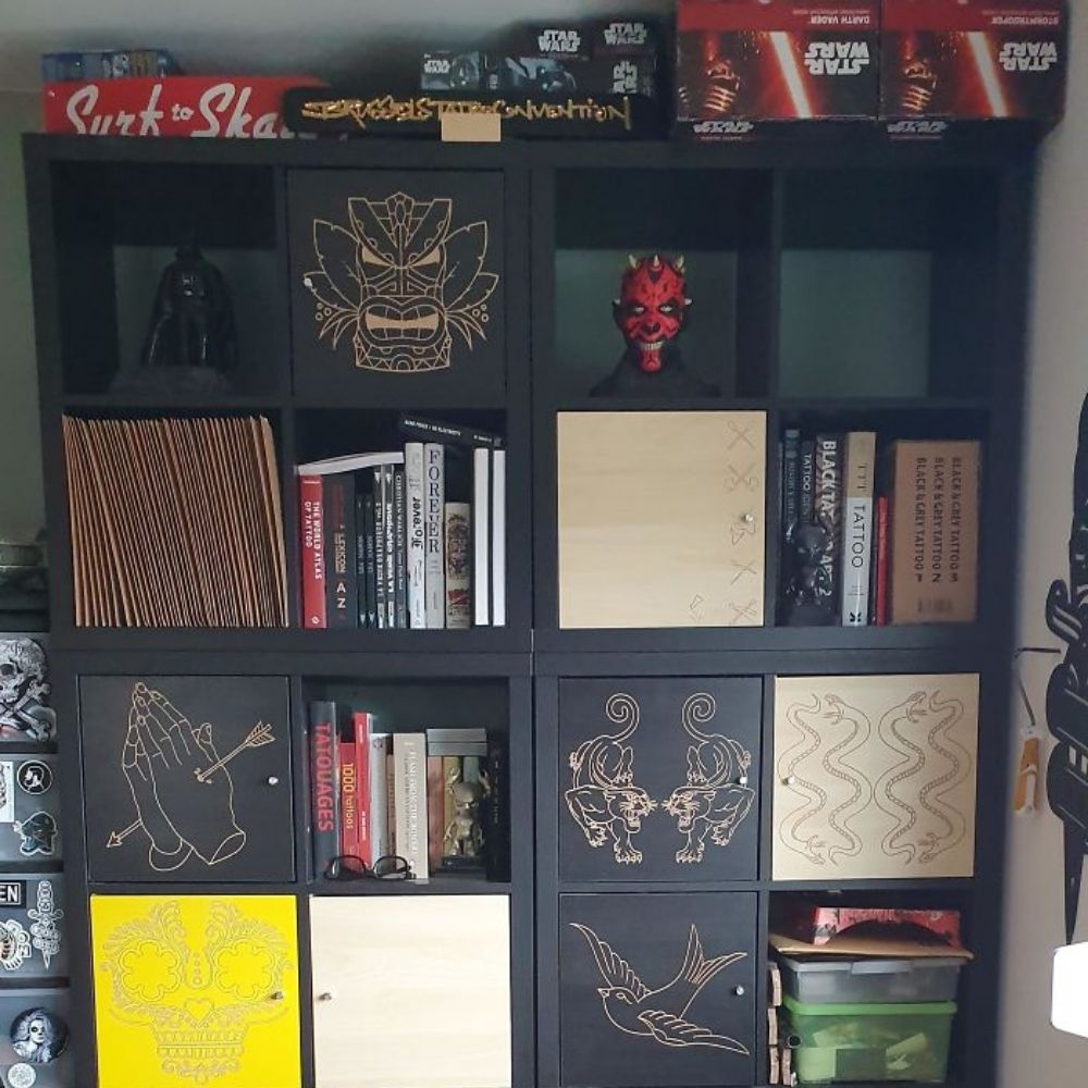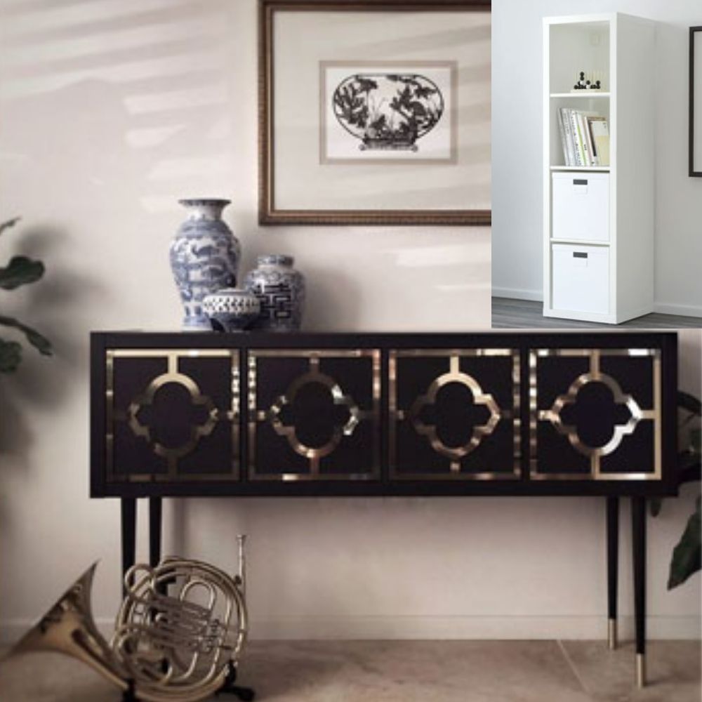 This person used turned an IKEA Kallax piece on its head, so to speak. By mounting some legs to it and giving it a good paint job — as well as some detail — this shelving unit quickly went from simple to a really sweet art deco piece.