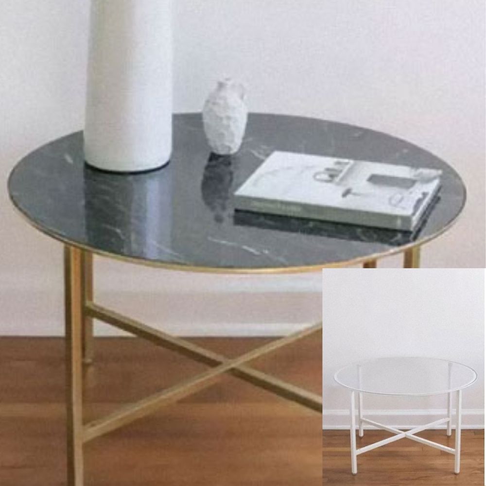 Take the gold paint and spray the frame of the table. Let dry. Then add the marble contact paper to the glass, and you have a classic looking coffee table that will be a great accent to any room.