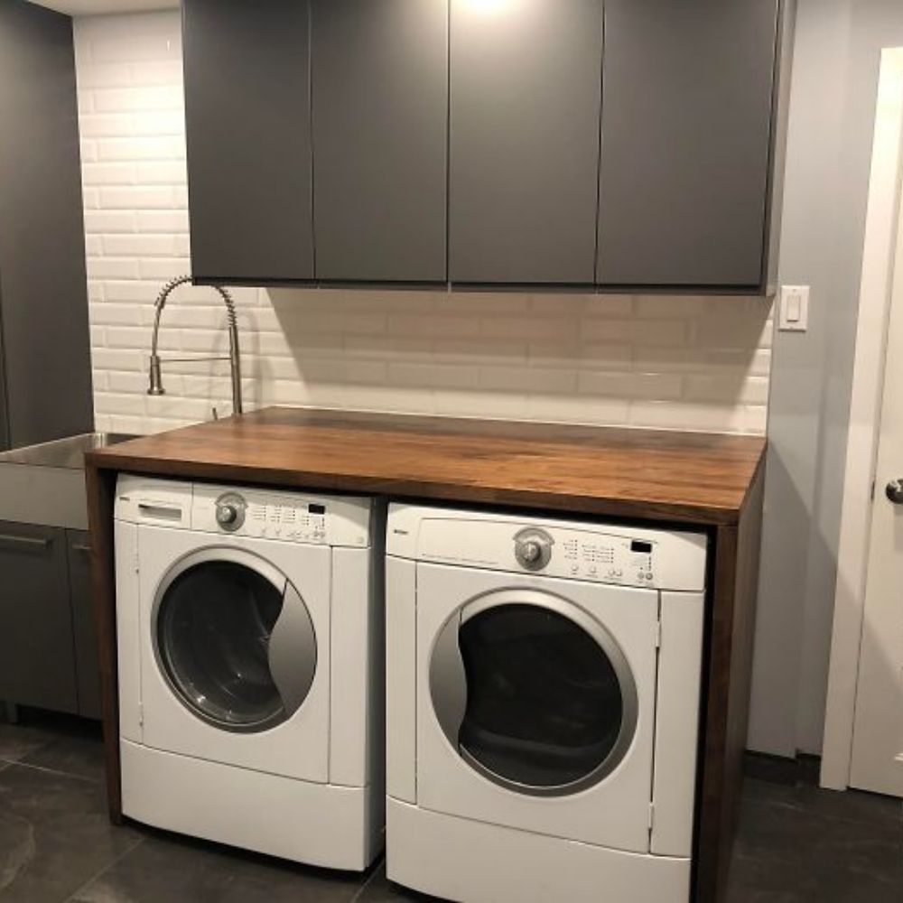 This person has made their laundry room look really modern and clean. They used a Karlby Countertop and a Voxtorp Cupboard system. Looks really good, right?!