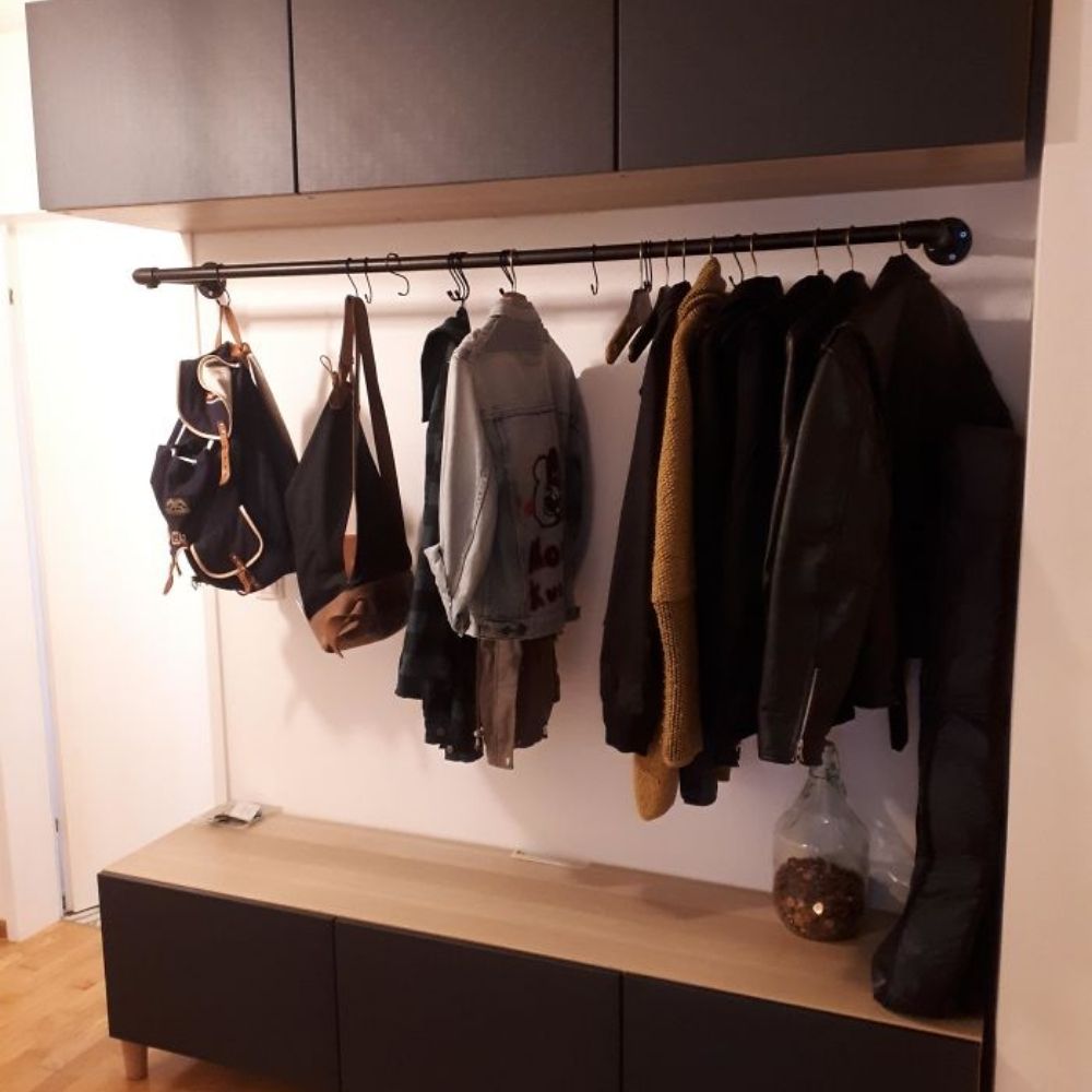 This person has used two Besta TV Cabinets to create an area for their clothes. The addition of the hang bar — in which people can hang their sweaters, jackets, and coats — in the center is a nice touch, too.