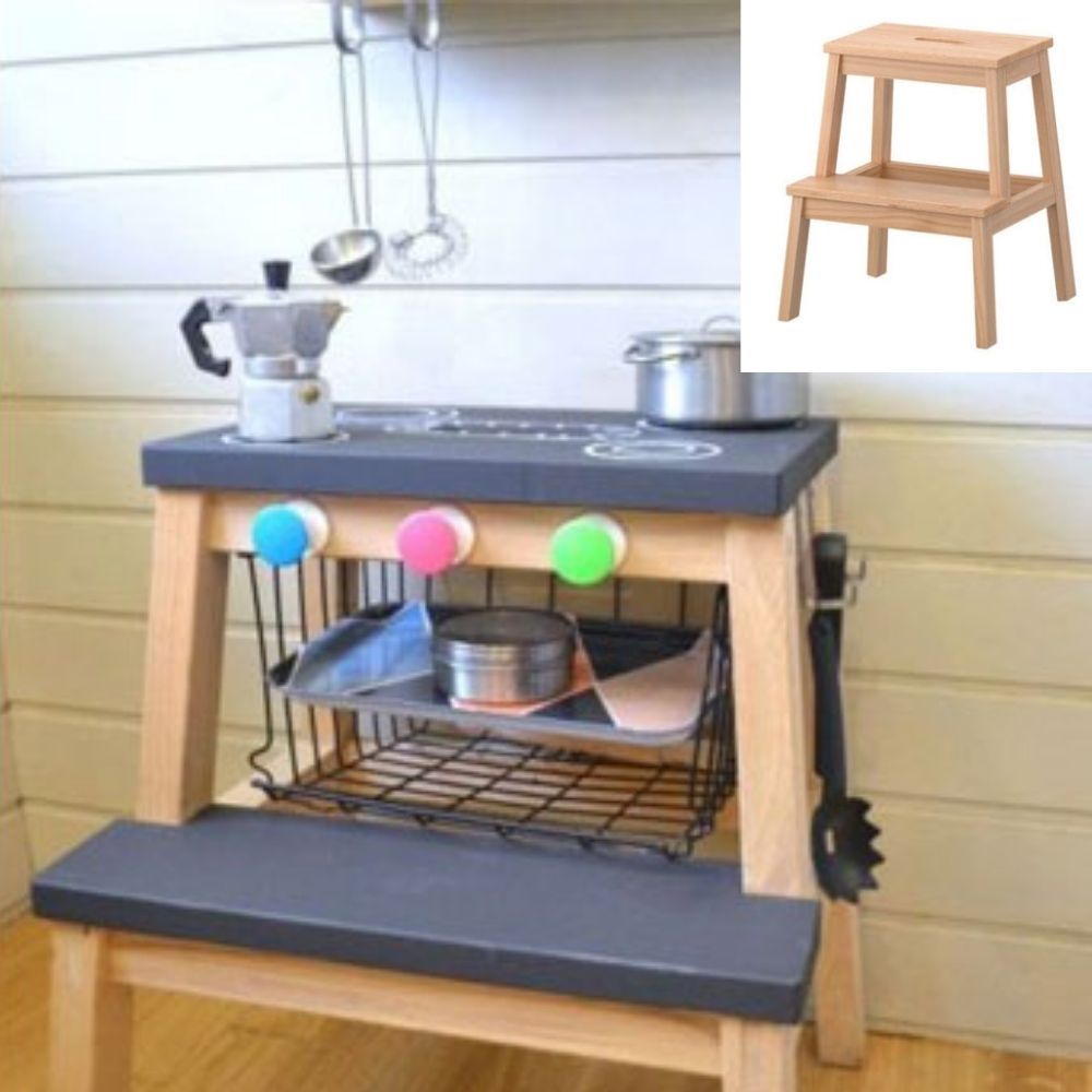 By taking a wooden step stool from IKEA and some chalk paint, you can create this fun play kitchen for your little one. Add a basket to hold all their kitchen supplies and let them whip you up a delicious imaginary meal.