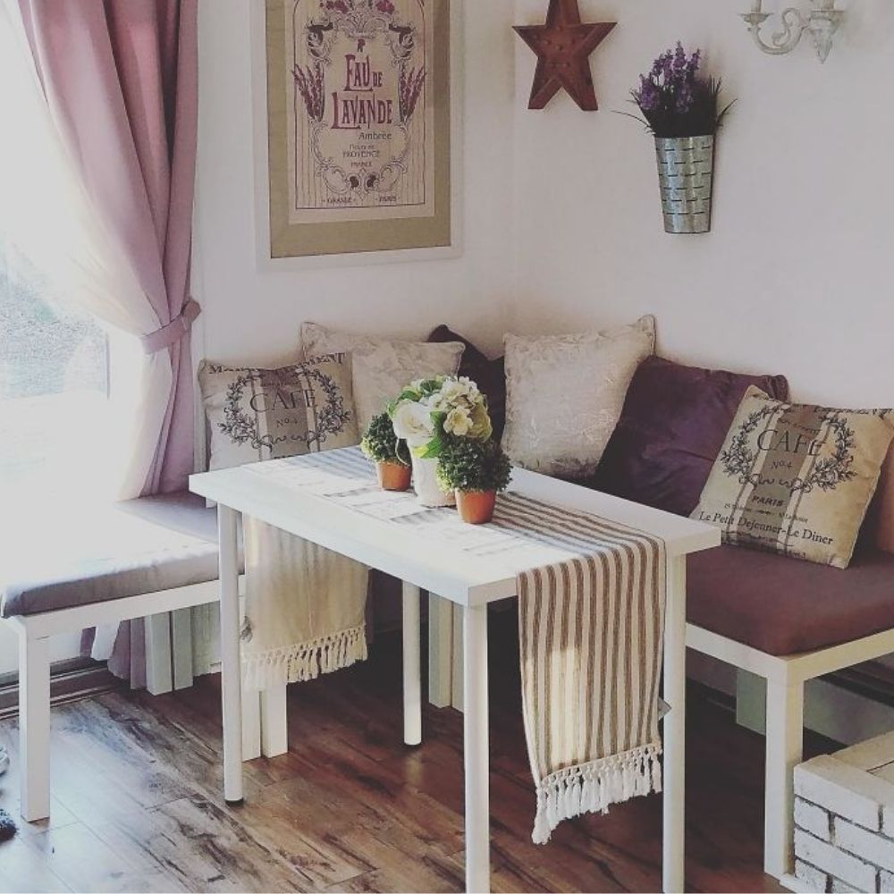 This person took a few Lack tables and added cushions — as well as pillows — to transform them into a cozy bench. Then, they threw in another table to round out the whole nook.