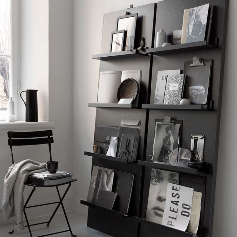 That’s what this person did. They took the Hack Magazine Holder and mounted it to the wall. Then voilà — you have an instant cubby for all your stuff.