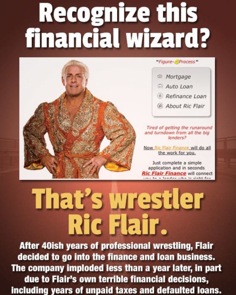 With this kind of firey personality, it doesn’t come as a shock that Flair has been chosen to represent many different brands. Still, we have to admit that Ric Flair Finance was nothing more than a disastrous online business. After all, would you trust to get a quote from a beef head that wears shimmery robes?