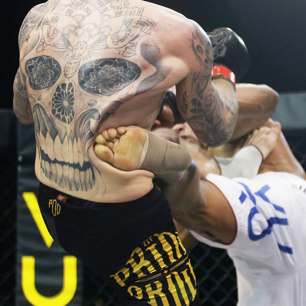 With a bit of help from practical effects, this photographer managed to get this dual perspective. While the fighter himself is taking this kick in his side, the tattoo on his back shows a skull getting kicked right in the jaw. Either way, this looks painful.