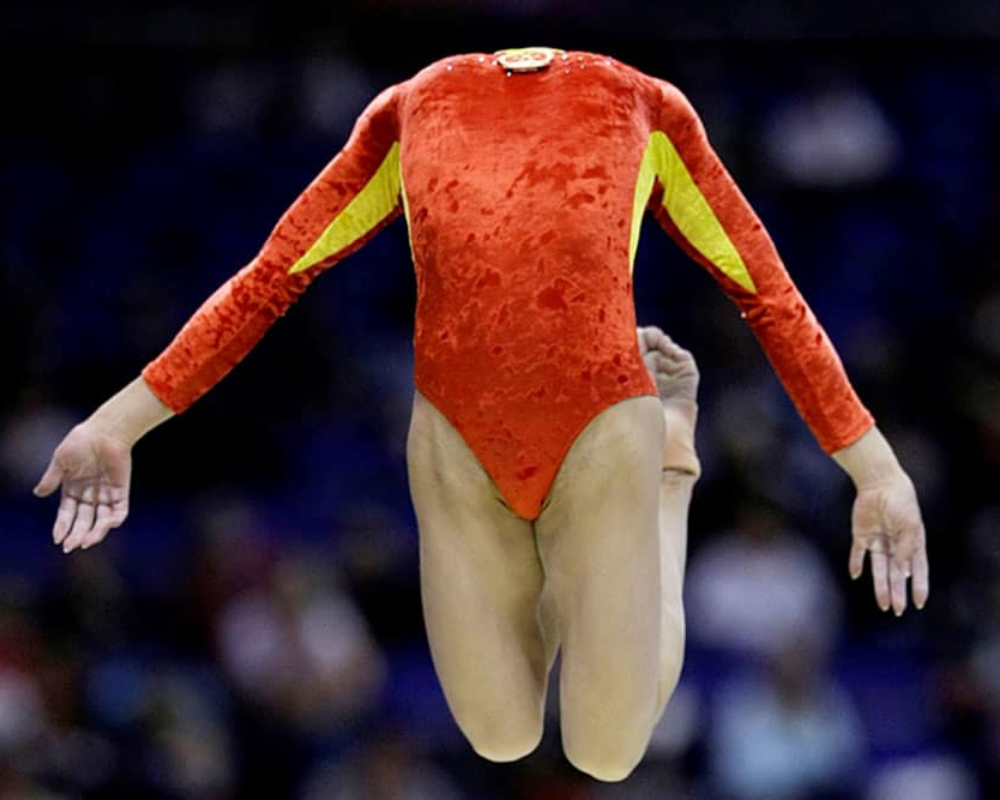 This athlete looks like they’ve lost their head in this photo. Yet, all that’s actually happening is that her head is bent this far backward mid-routine. It’s bent so far back, in fact, that the photographer couldn’t even capture it from this angle. The floating effect is just the gymnast mid-jump.