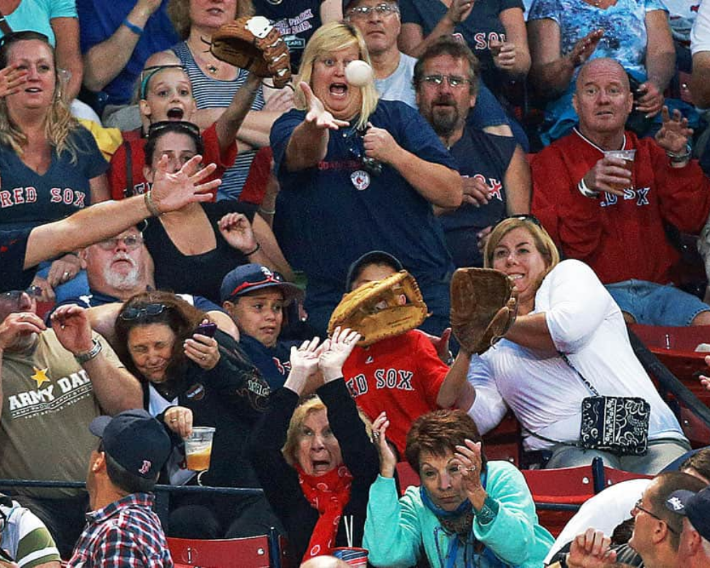 In photos like these, you can see just how much fans are scrambling to be the ones to catch the ball. The winning prize went to unexpected interference, though. This mom managed to catch the ball with ease in her mitt while still keeping a tight grip on her baby.