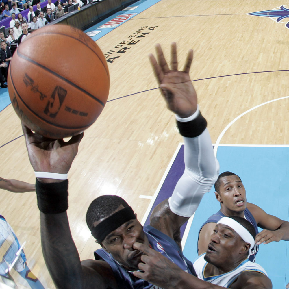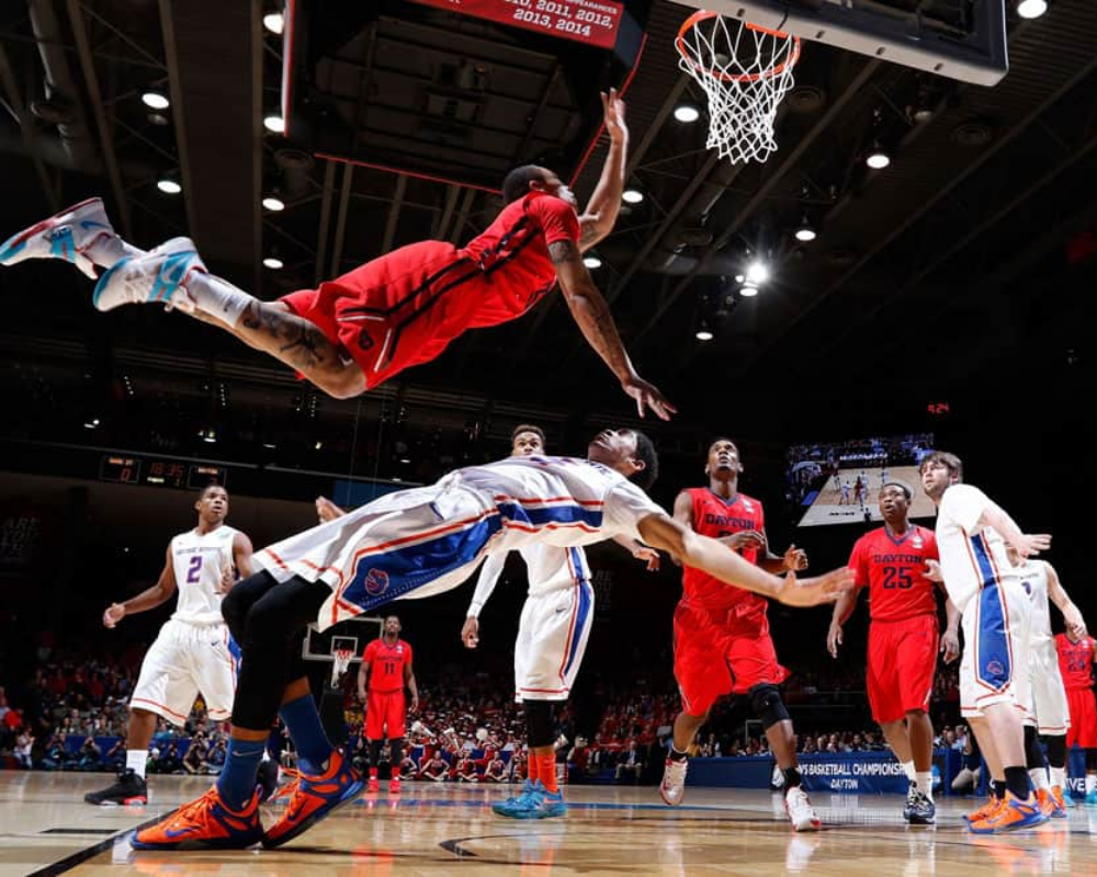 In this image, the photographer caught a perfect shot of two players as one of them went to dunk a shot. The photo catches the player in red sailing over the one in white with the latter leaning incredibly far backward. We’re sure that they looked a little less graceful a second later.
