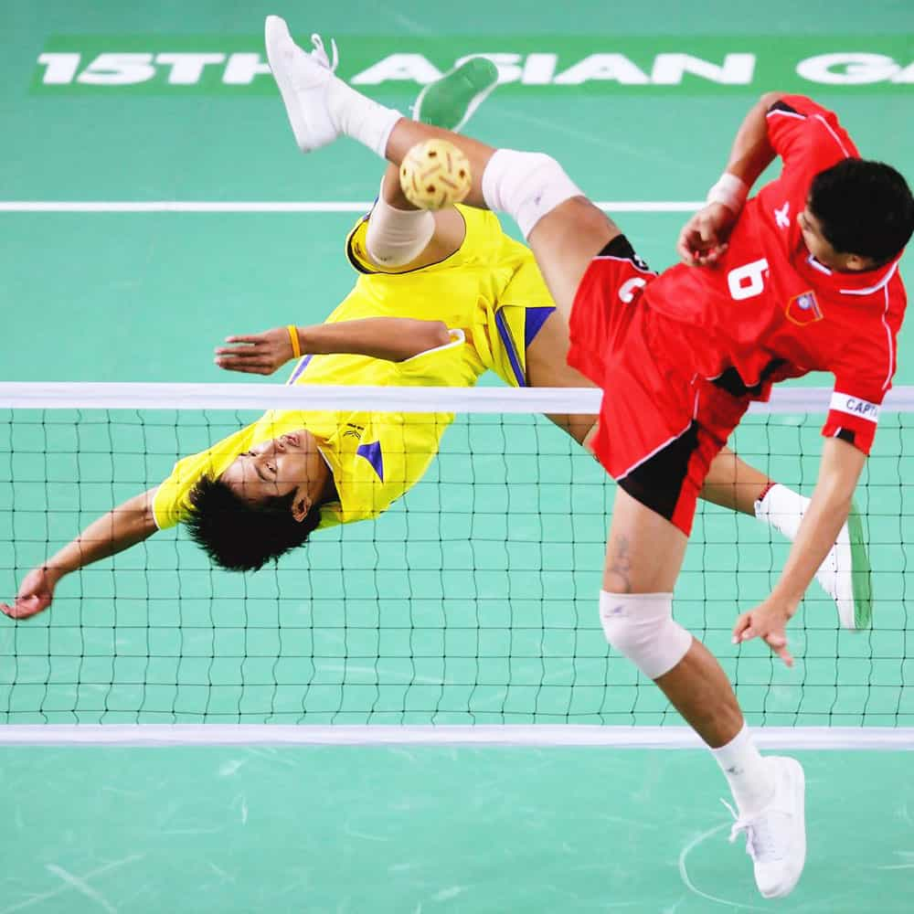 This picture can look pretty confusing, especially if you aren’t familiar with the game. This is a sport called sepak takraw or, in plain English, kick volleyball.