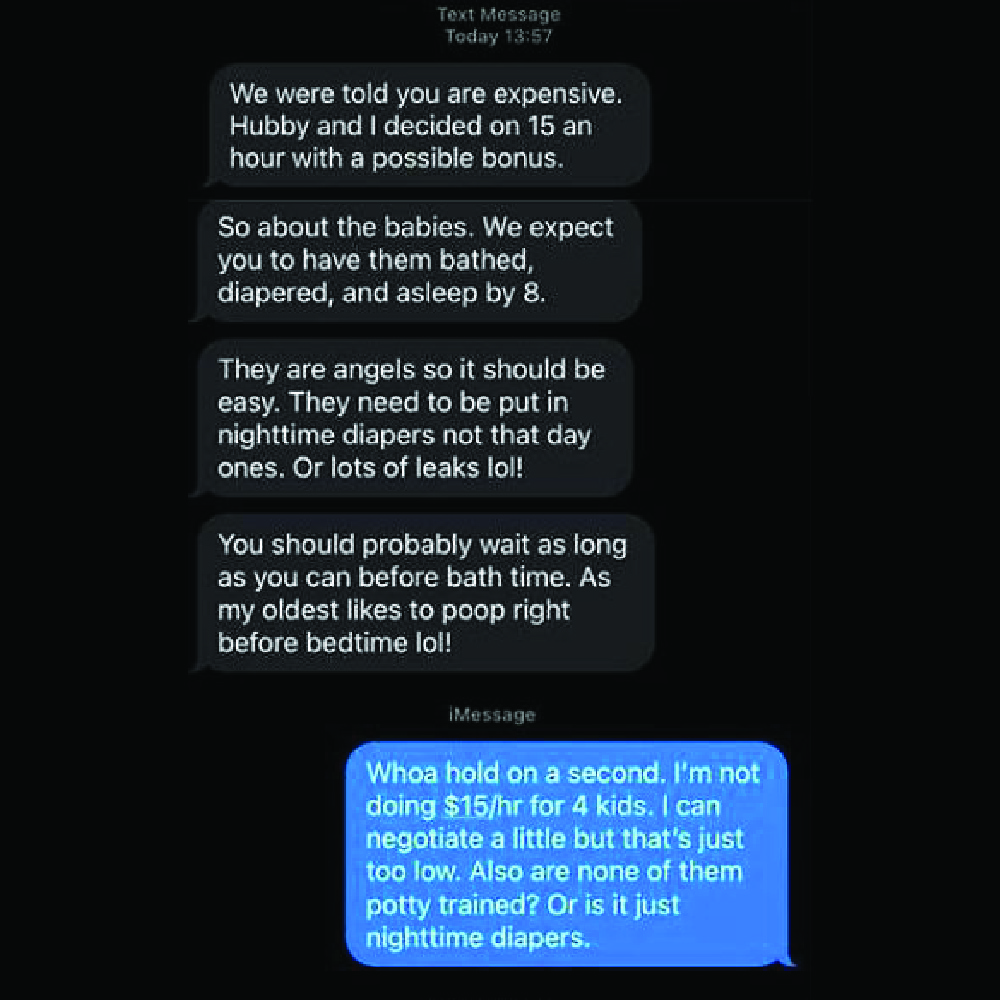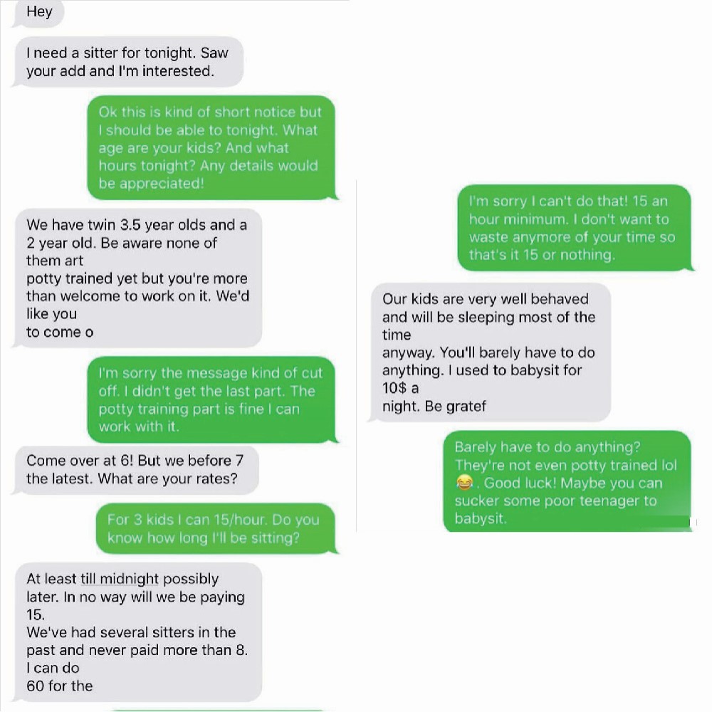 $15 an hour for two kids that need constant attention is totally reasonable. Not only did the parents have the audacity to question the babysitter’s rates, but they also patronized them about how they should be grateful for the $10 they’re willing to pay.