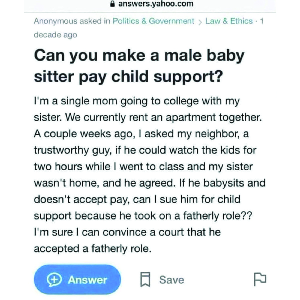 Instead of being grateful, she tried to devise a disturbing yet utterly stupid plan. To answer her question, she cannot sue a random male for child support simply because he took on a caregiver’s role for one night. This isn’t a dystopian society.