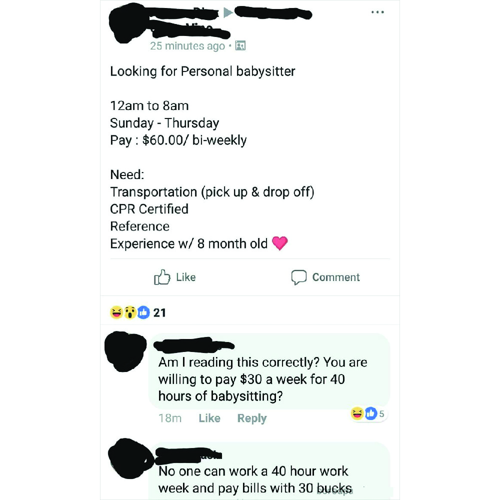 A personal babysitter advertisement with requirements like CPR certification and references. Seems fair enough. When you ask for quality service, you have to be ready to pay for it. What’s not okay is paying $30 for a 40-hour workweek.