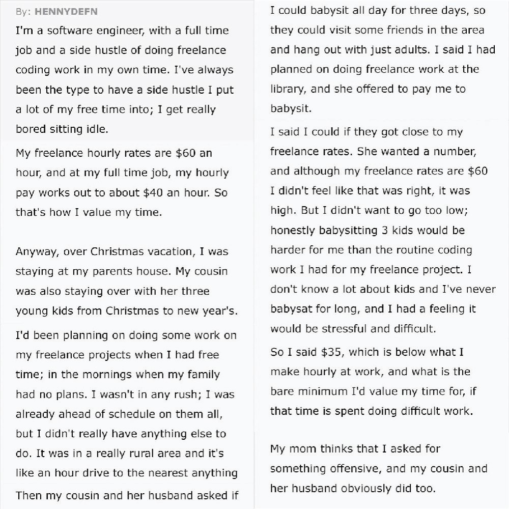 A freelancer and software engineer, a man was shamed by his own family for asking $35 to babysit. He would be making $40 an hour on her freelancing gig, so $35 per hour for three children was a great deal.