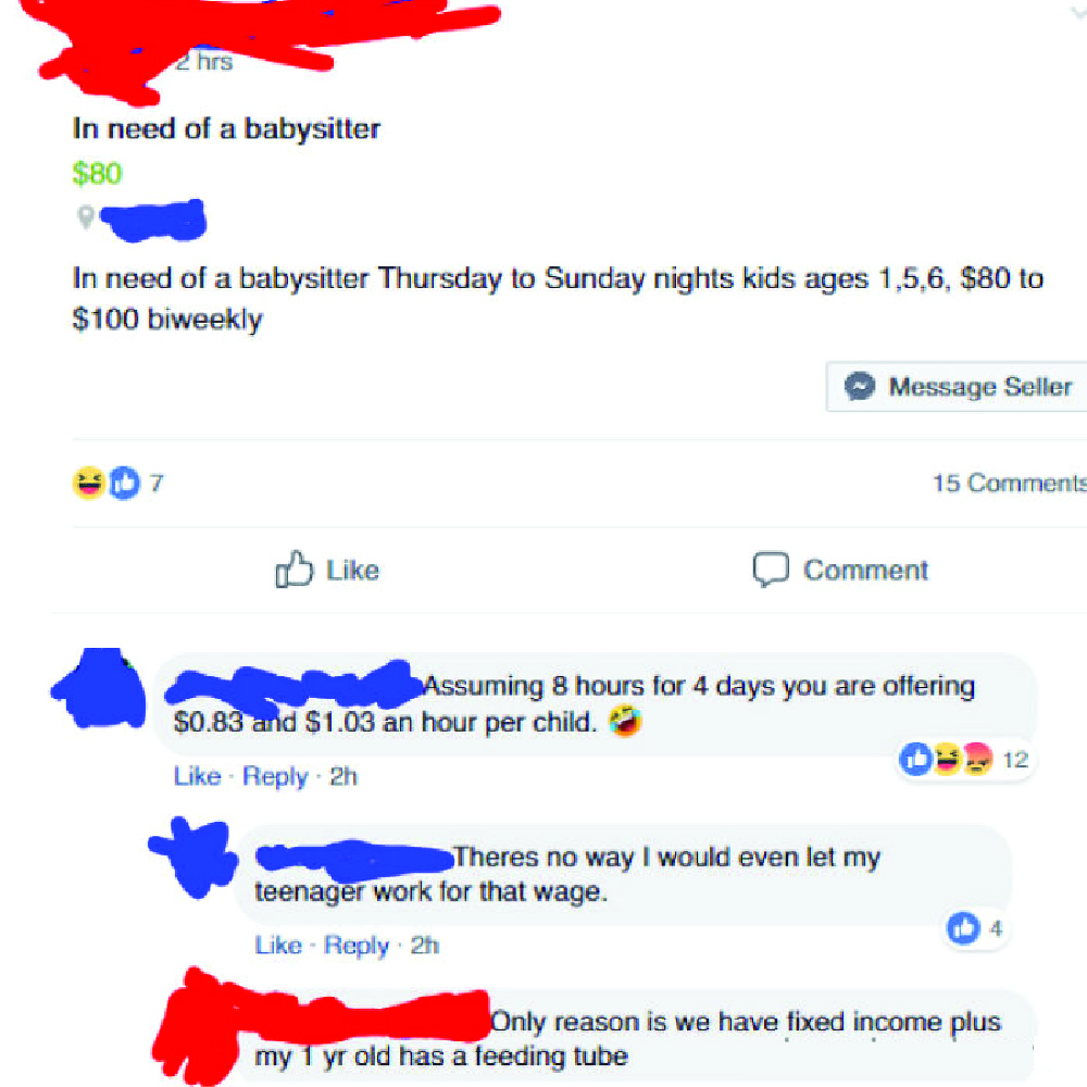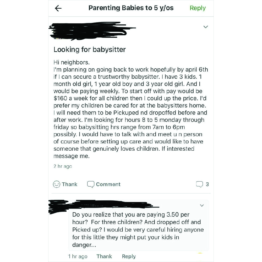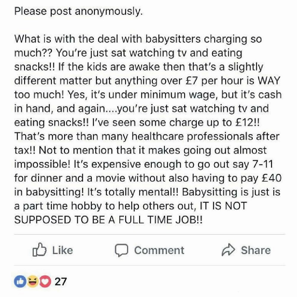 For the first and last time — babysitting isn’t a hobby! For many people, it’s a source of permanent income. Babysitters don’t put thousands of dollars into training and childcare studies for dense parents to call them mental for charging decent rates.