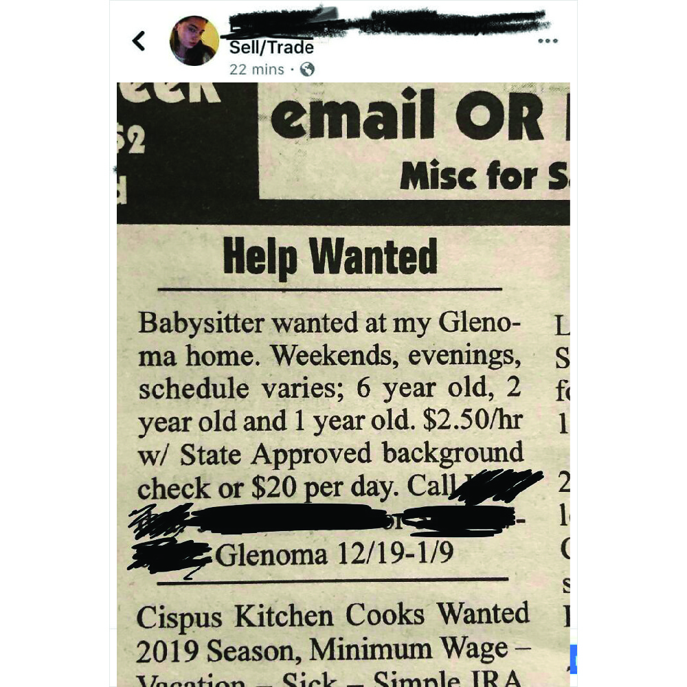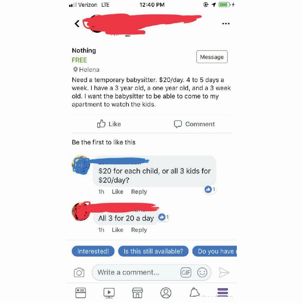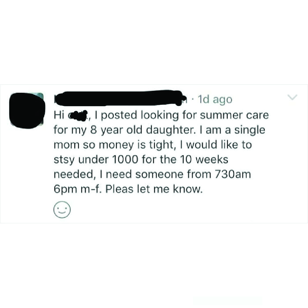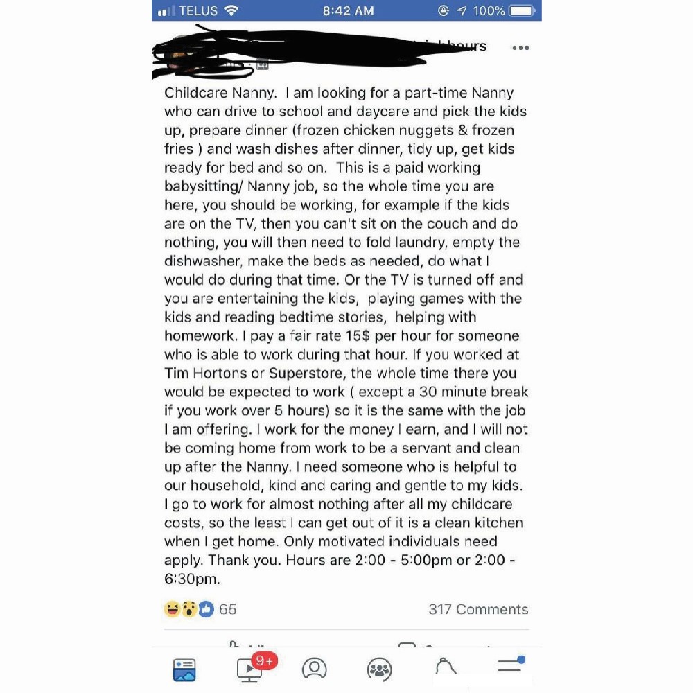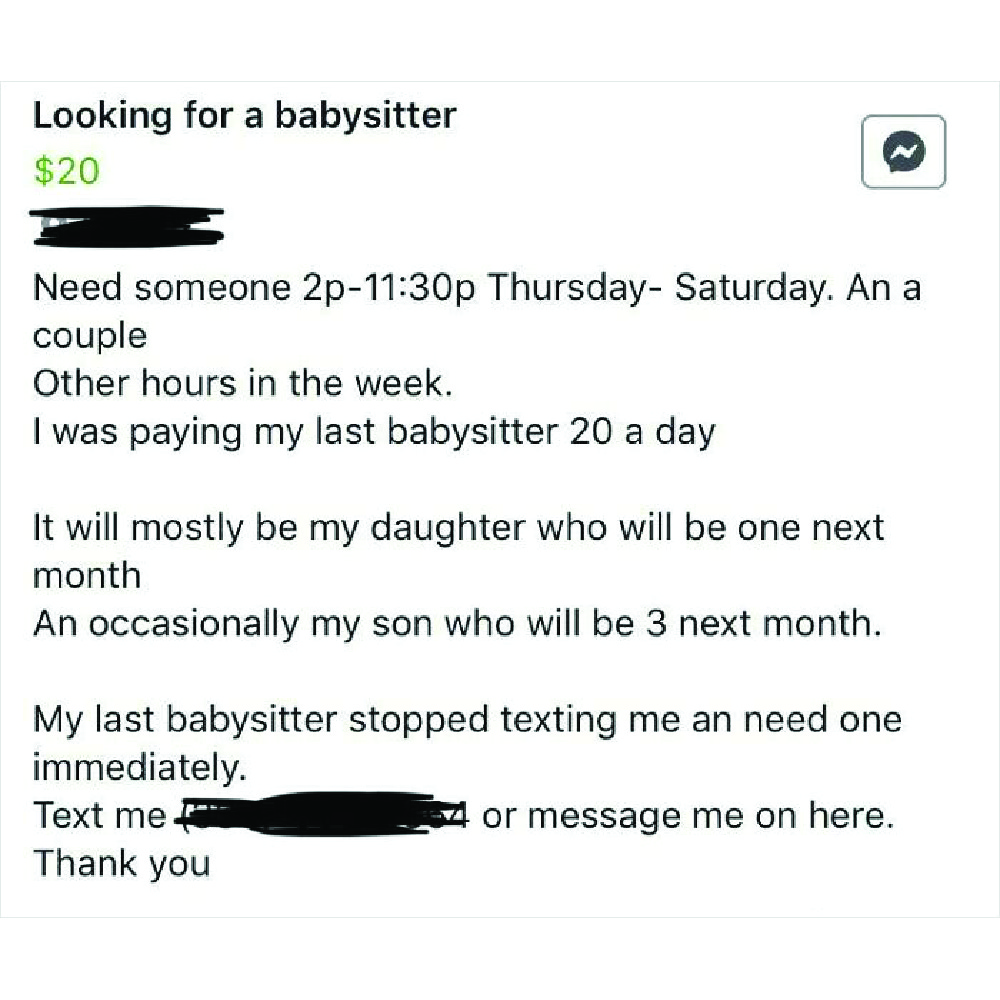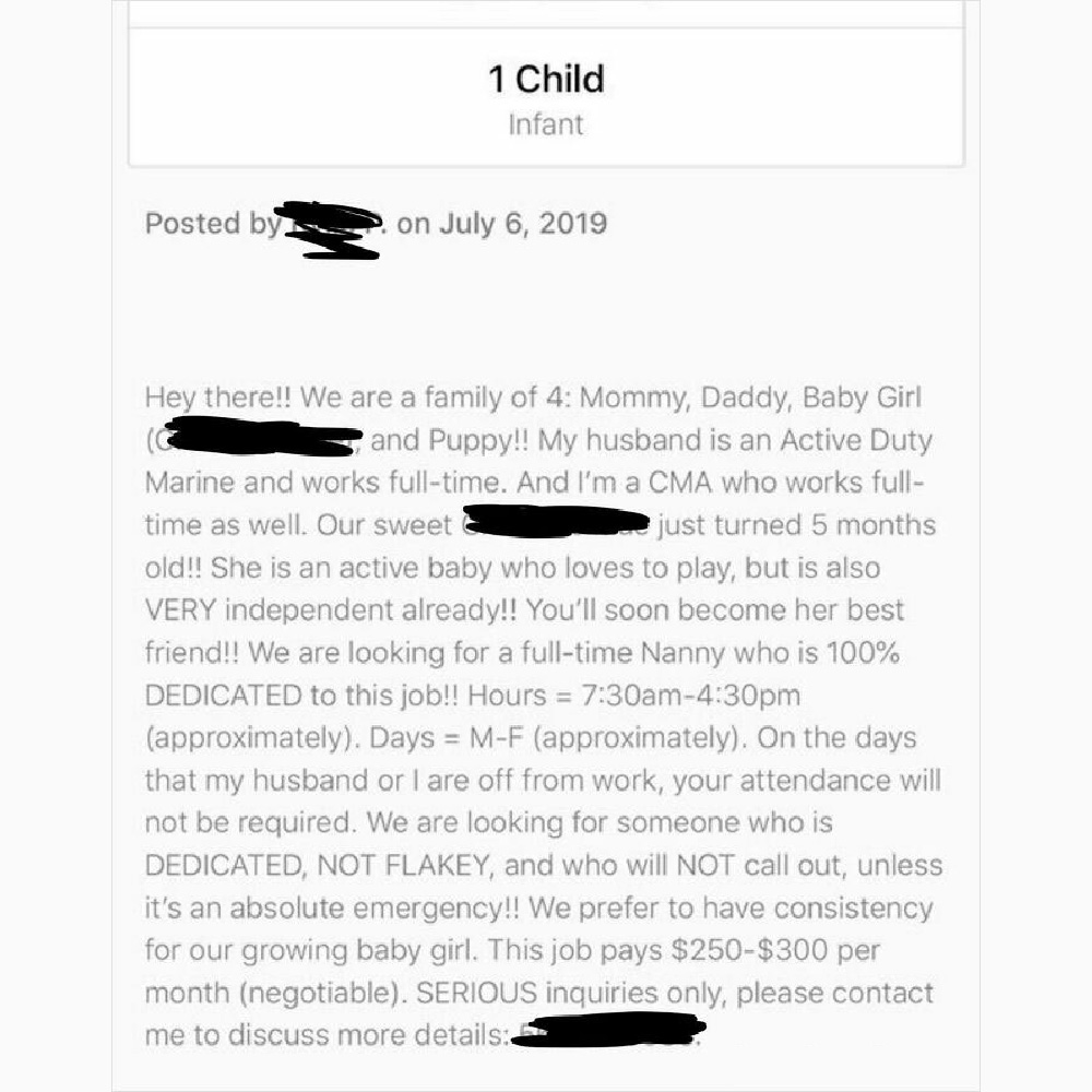 Combine that with the working hours (that haven’t been mentioned so it could be a 10-hour workday), and the rates are an actual joke. A babysitter could make less than two dollars. The poster of this advertisement is questionable too, stating a “babysitter” took the life of her first child.