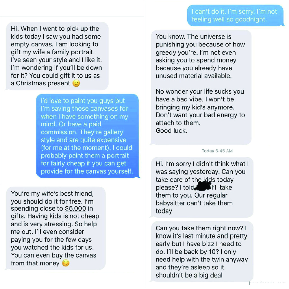 The texts start off seemingly okay, with the man praising the babysitter on their art style. It’s not long before the messages take a weird turn and we’re rendered speechless. He wanted to take advantage of the fact that the babysitter was his wife’s friend.