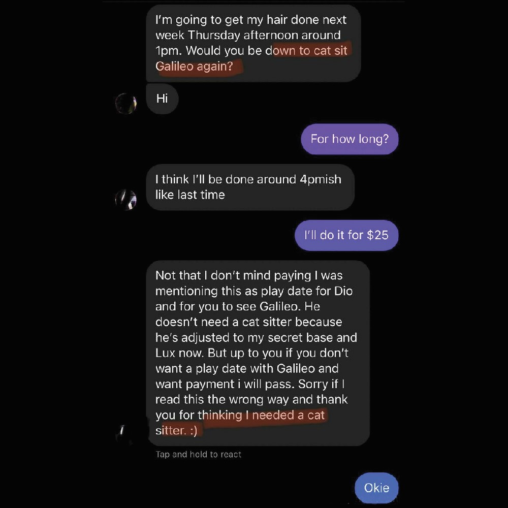 When they heard the rate for three hours of cat sitting, which was a fair price of $25, they turned on their words immediately. Perhaps they forgot you can read texts from the other part if they’ve not been removed. Funny how they didn’t first mention the cats’ play date.