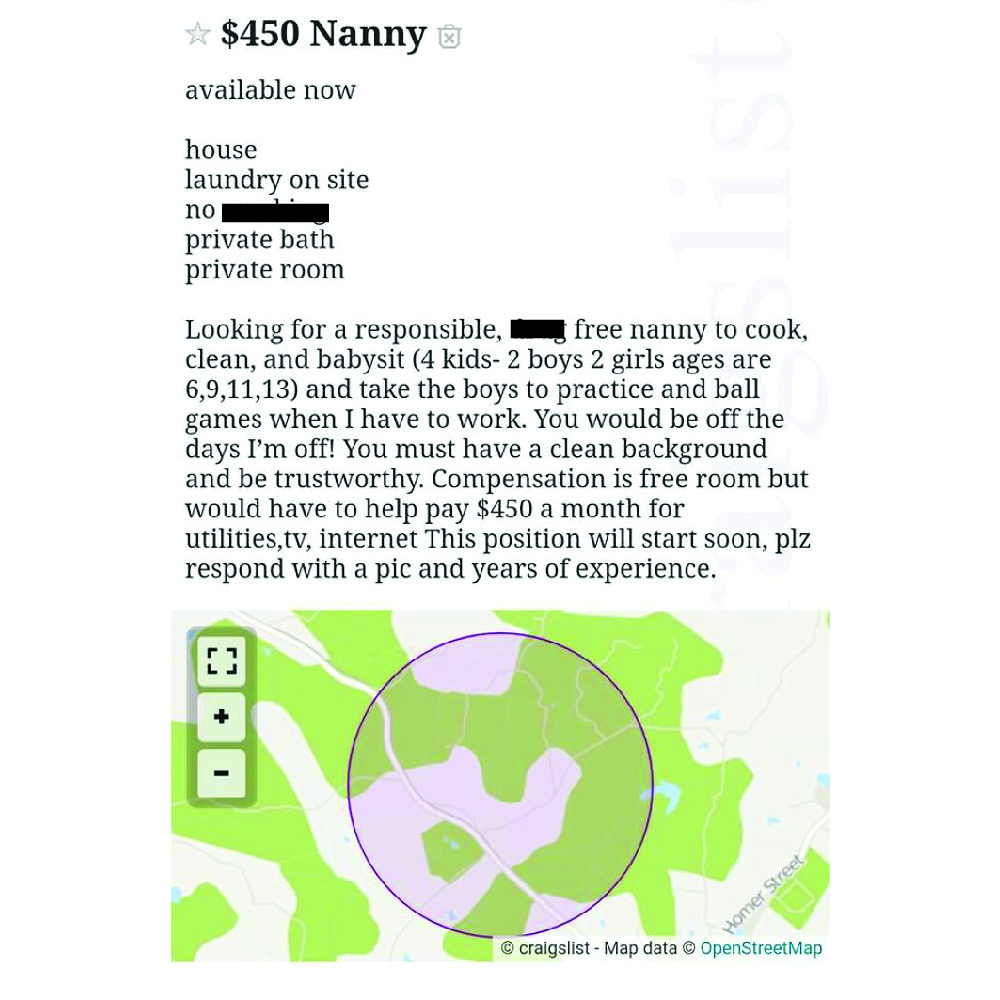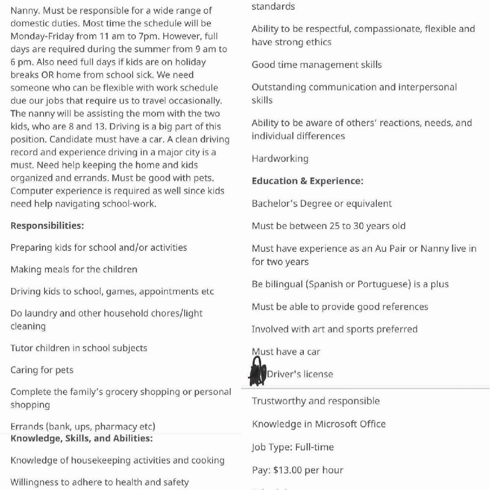 There’s so much going on in this job advertisement. First of all, the parent says they will pay for the job by giving the nanny a room. That would be okay had the nanny been asked to work for a few specific hours each day.