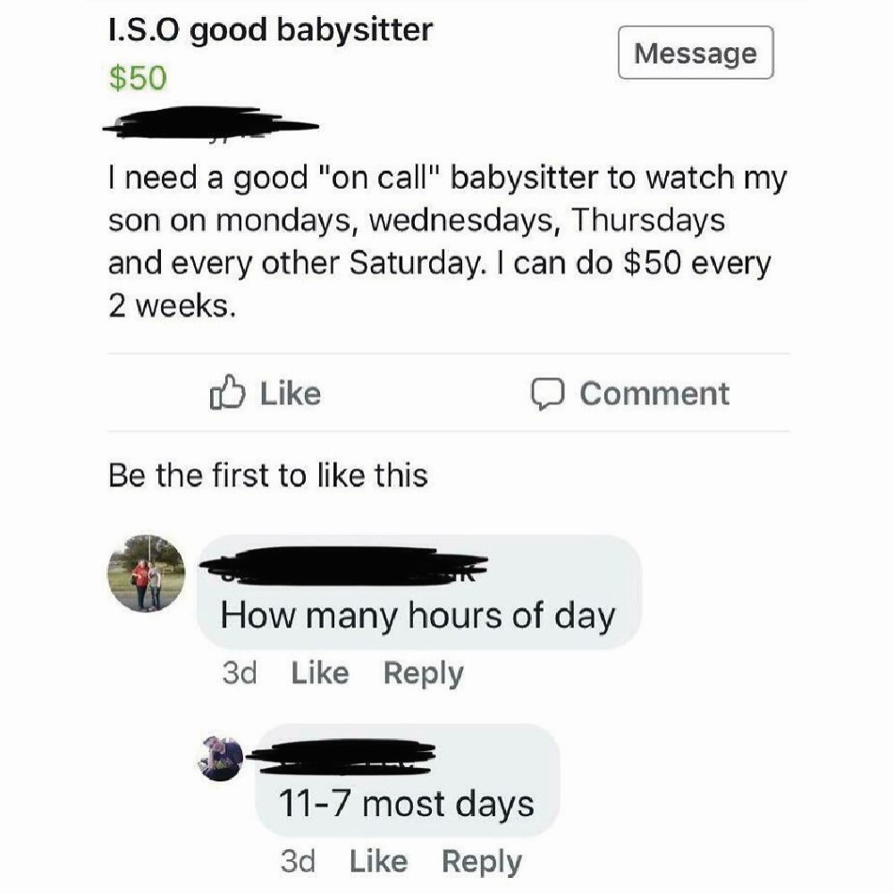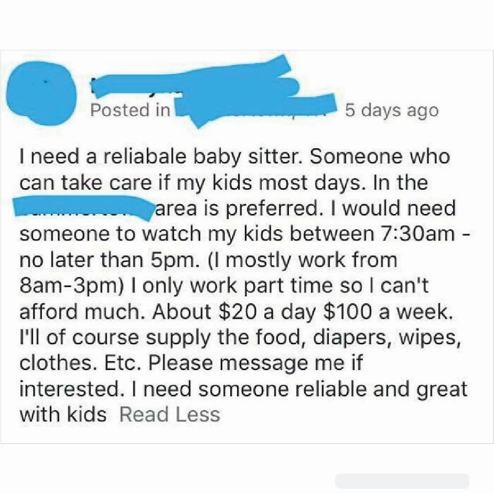 “Reliabale” babysitter required. The post indirectly states that it will pay the babysitter next to nothing, but there’s nothing to fear! The parent will supply the essentials their baby requires. Read that again.