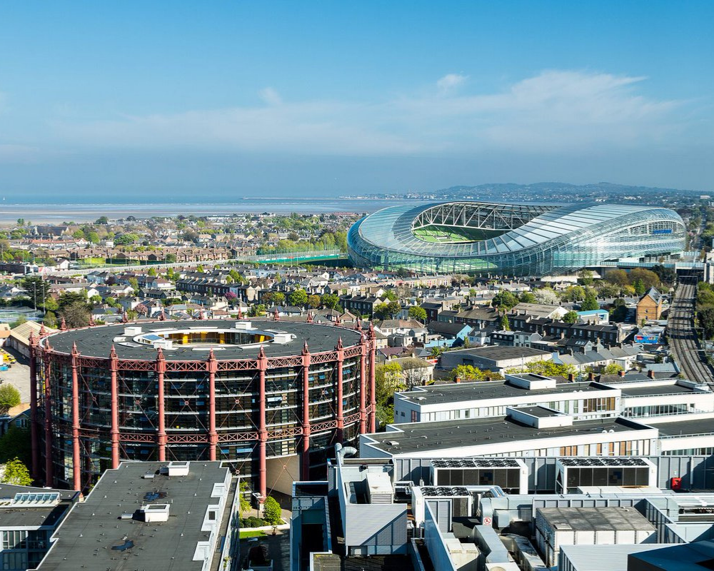 This stadium is the home the Irish national rugby union team and the Republic of Ireland soccer team. It takes into consideration the close proximity to local homes, and thus has a sweeping curve at the north end designed to allow as much natural light to hit the homes throughout the day.