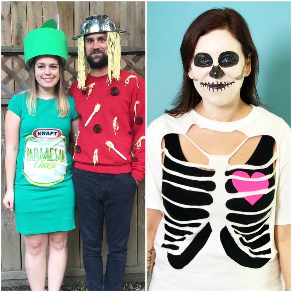 Sarah and Nick are huge pasta fans, so they decided to dress up as one of their favorite meals when Halloween came around: spaghetti and parmesan cheese. According to their tutorial, all they needed was a green and red shirt, a colander, some string, plastic forks, and a few other materials.