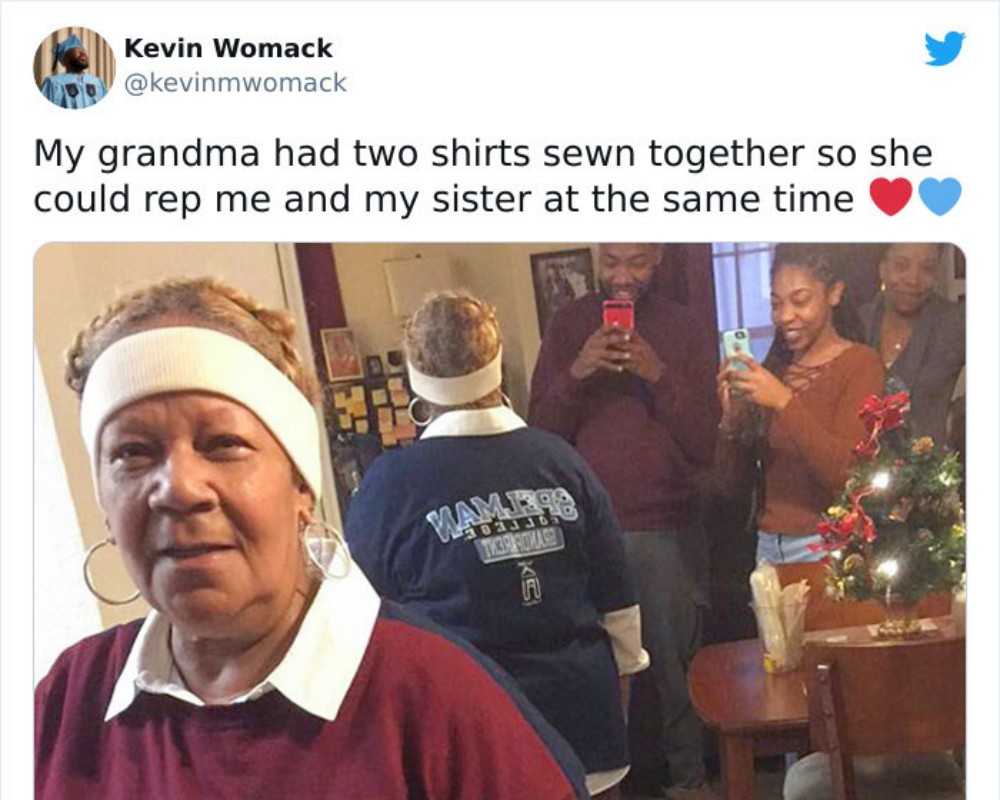 When this lady’s grandson and granddaughter went to different colleges, she was torn. How could she show her love and pride in them both? Wear one college sweater in the mornings and the other in the afternoons? Wear one from midnight Sunday to midday Wednesday and the other from Wednesday afternoon to Sunday night?