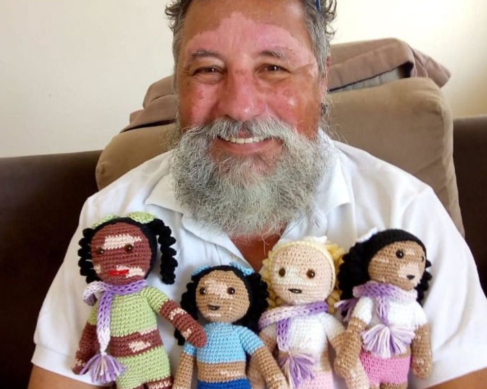 Once he’s knitted the dolls, he sends them to youngsters around the world who also have vitiligo. The idea behind his generosity is to make the kids with vitiligo feel better. What a brilliant, unsung hero!