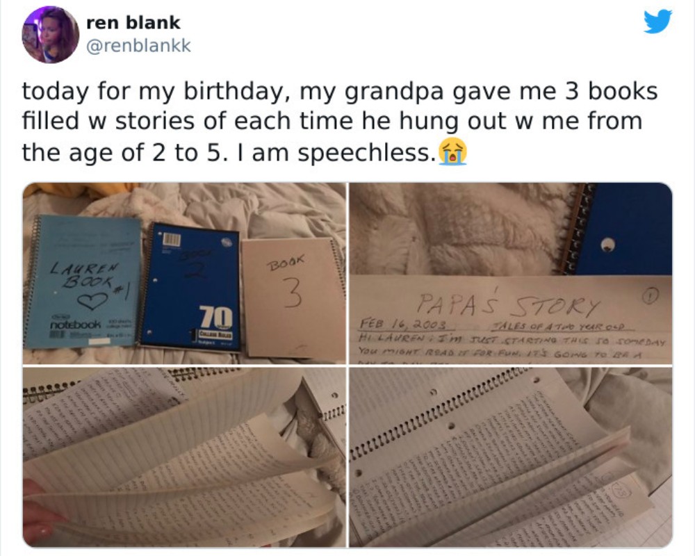 Twitter user @renblankk tweeted to show what her grandfather did for her when she was a toddler. Going by the dates, we’re guessing that Lauren is now in her early 20s. And starting back in 2003, her grandpa filled three notebooks with stories of when he used to babysit Lauren between the age of two and five.