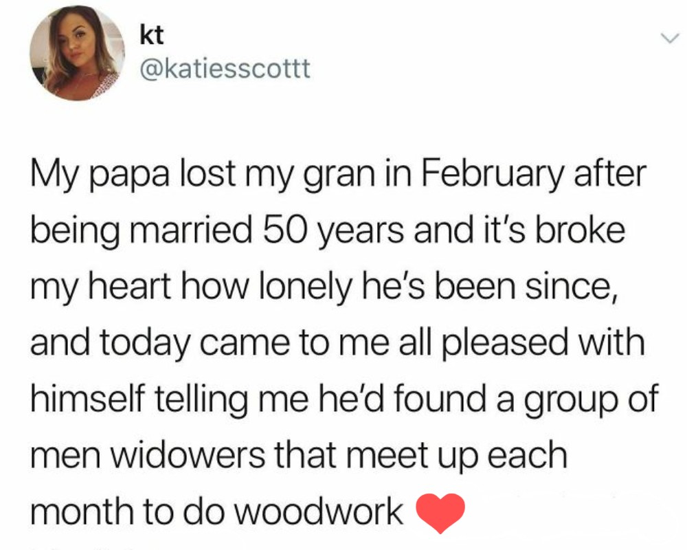 This story is as inspirational as it is heartbreaking. When Katie’s Papa lost his wife after 50 years of marriage, it hit him hard. The grieving widower was lost and lonely without his life partner until he joined a local woodworking group made up of fellow widowers.