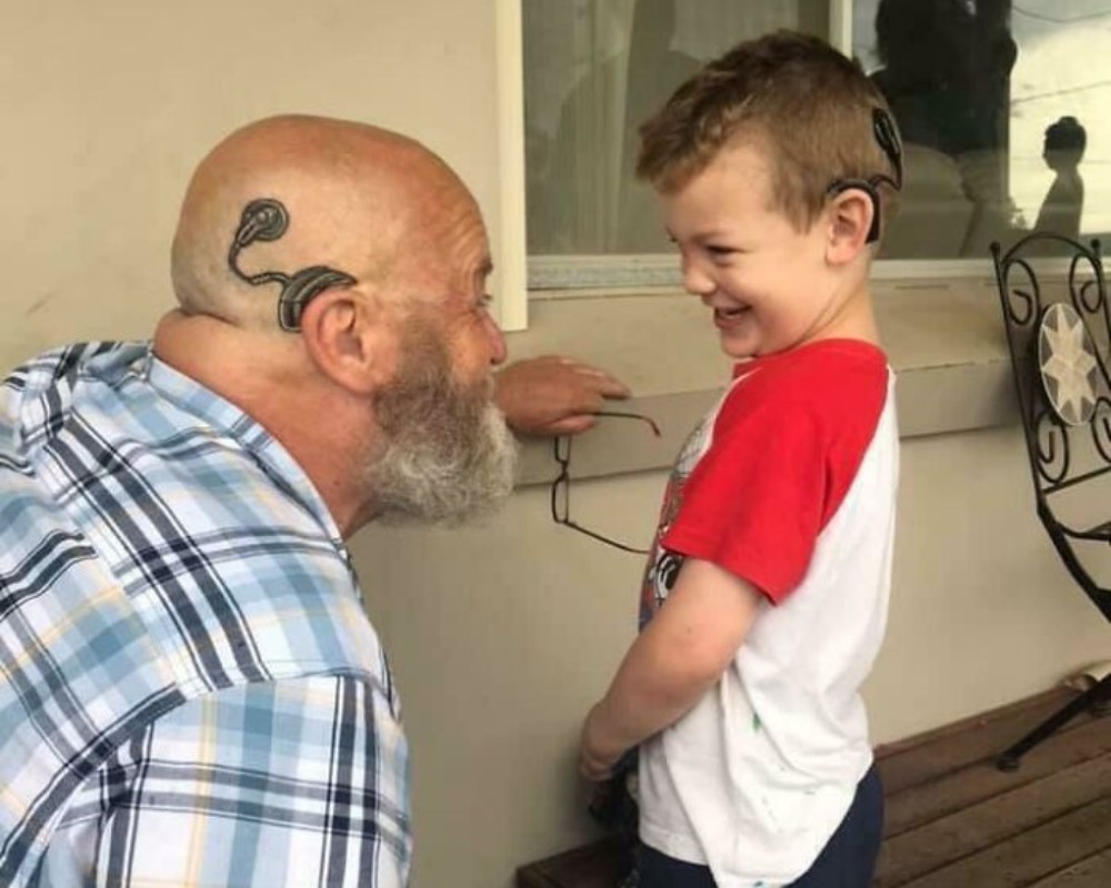 Now, granddad just so happened to be bald, so he had a cochlea implant tattooed on his noggin above his ear so his grandson would feel better. Is this the coolest Pops ever? We think so.