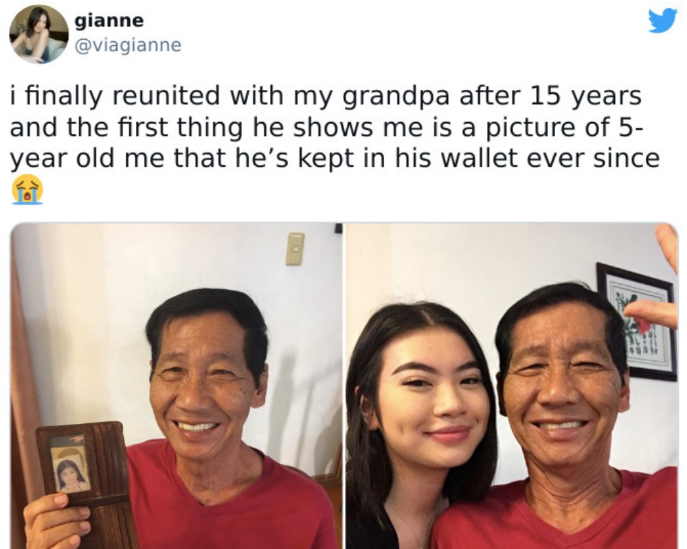 This young lady hadn’t seen her grandfather in 15 years — and they were both overwhelmed when they were reunited. After lots of hugs, laughs, and smiles, the first thing he did was reach into his back pocket and pull out his wallet.
