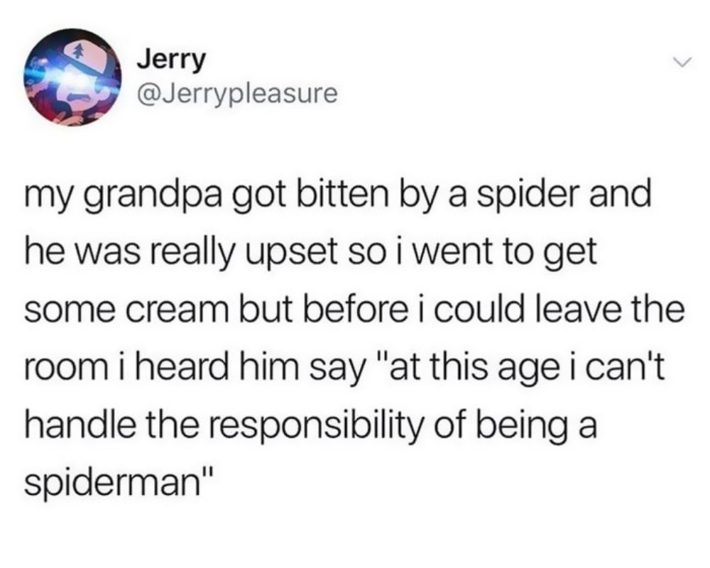 In what Jerry describes as an upsetting moment — or so he thought — Grandpa used his wonderful sense of humor to calm the situation, just like Peter Parker or any friendly neighborhood Spider-Man would.