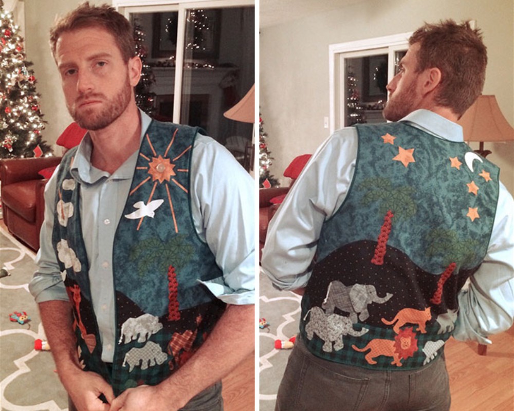 This dude’s 90-year-old grandmother made him the world’s snazziest waistcoat to wear to parties. The technicolor waistcoat features an African savannah scene made up of lions, elephants, giraffes, and rhinos because she still thinks her grandson is six years old. Bless her.