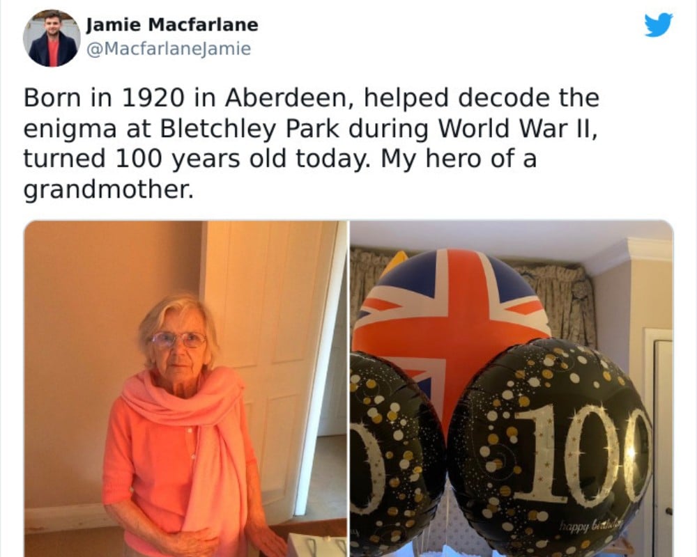 But, what makes Jamie’s gran’s special day even more noteworthy is that she’s a genuine war hero. The Aberdeen native worked at Bletchley House on the Enigma Machine, which decoded Nazi messages to help the allies win World War II. Thank you for your service, Ma’am!