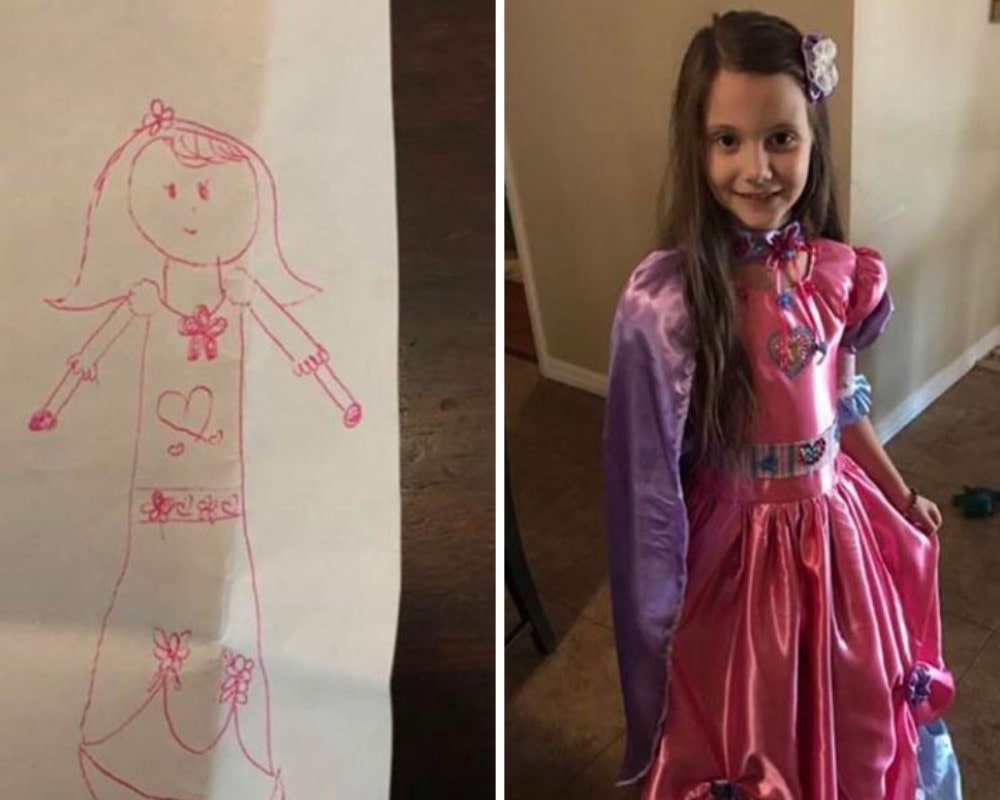 Grandma had made the little girl’s drawing into this perfect pink, purple, and blue dress. And doesn’t she look just like a princess? Well done, granny!