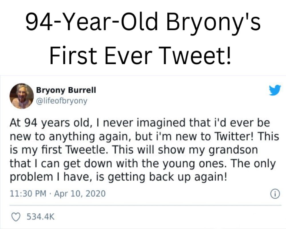 In 2020, the 94-year-old grandmother proudly fired off her first tweet to show her grandson that she was still down with the kids. She even jokes that her only problem with being down with the young ones is getting back up again. What makes it even cuter is that she calls her first tweet her first Tweetle!