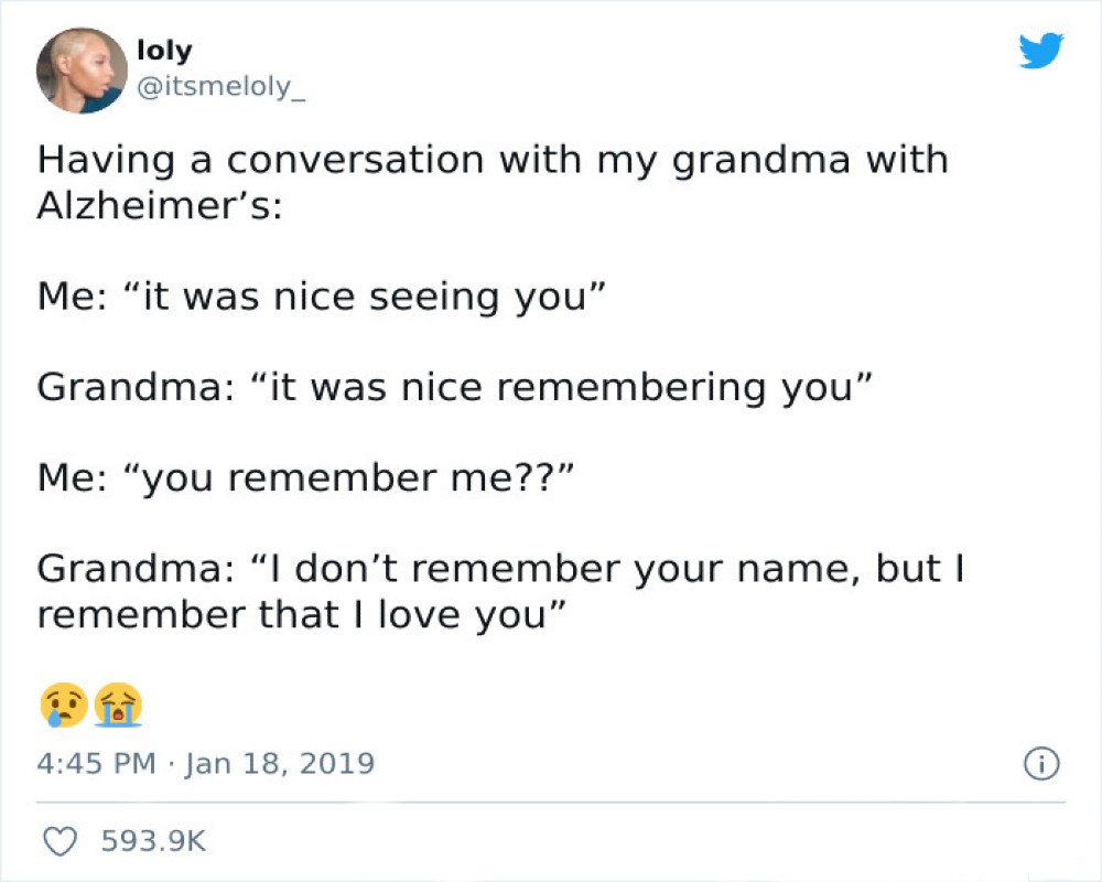 Twitter user Loly tweeted this heartwarming exchange between her and her grandmother. Sadly, her gran has Alzheimer’s and some days doesn’t even recognize her family. But thankfully, Loly’s gran has a heart made of pure gold, so the love still shines through.