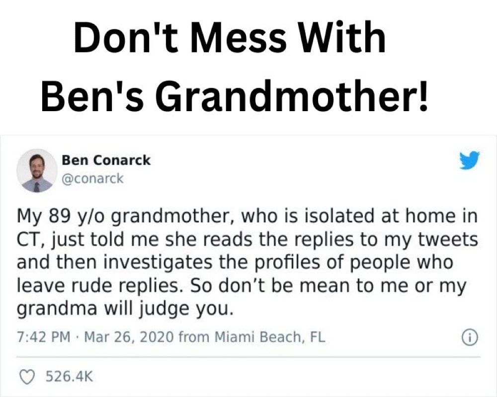 Twitter user Ben revealed his nearly nonagenarian nanna trawls his tweets looking for anyone that’s made mean replies. If she does find any mean replies, she then takes it upon herself to “investigate” those cruel people’s profiles. While it sounds cute, the longer you think about gran going rogue, the worse it gets.