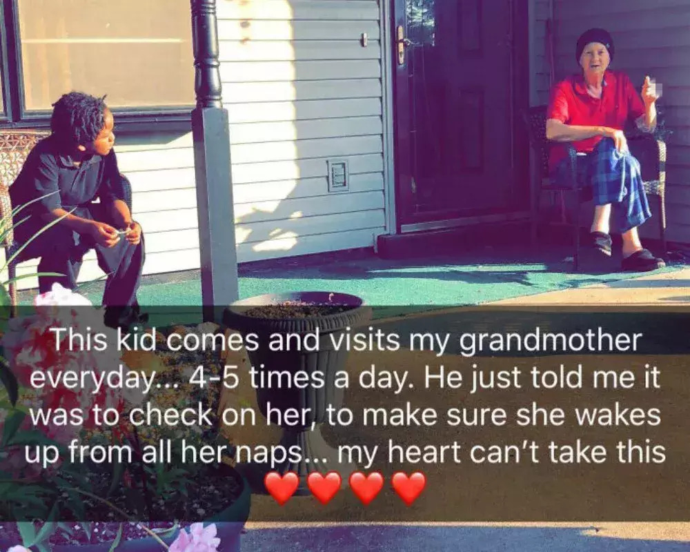 As the caption shows, this kid comes around several times a day to check in on this lady. He says he visits to make sure she wakes up from her naps. Then, remaining socially distanced, this odd couple hangs out on the porch and chats about life.