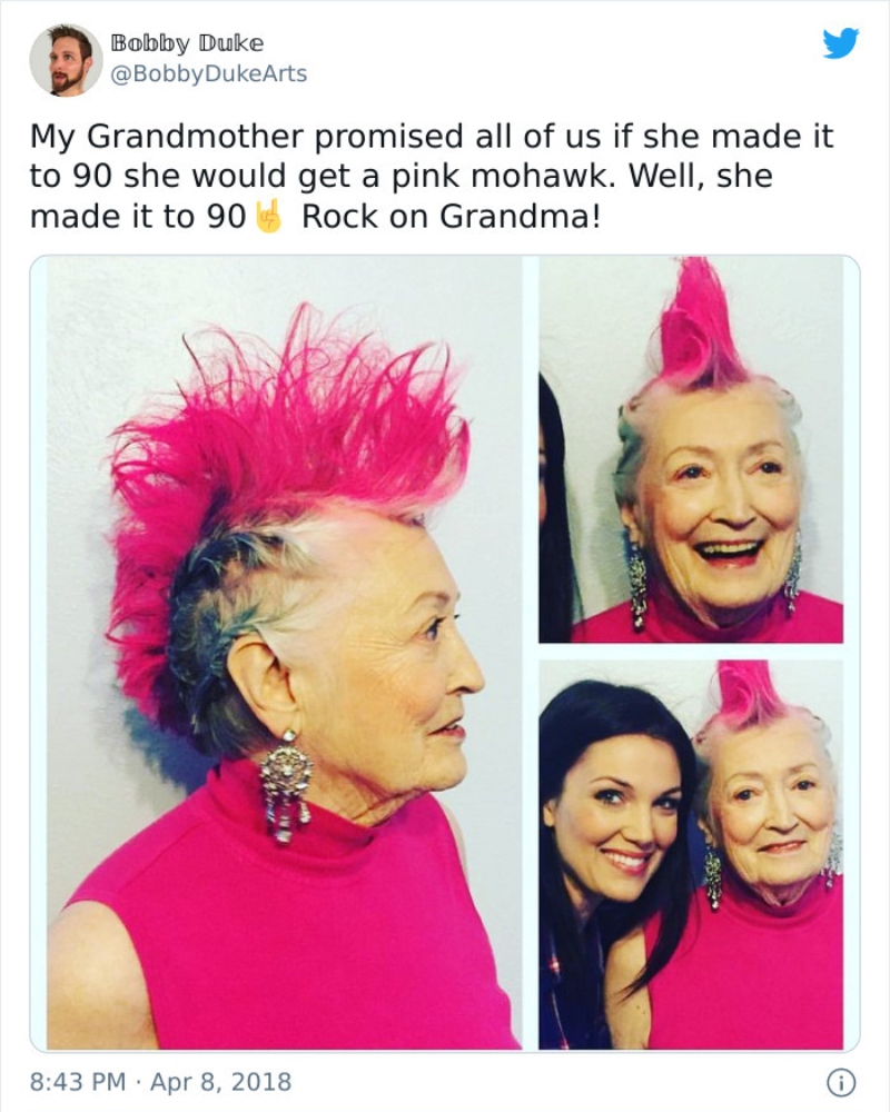 This trendy grandmother promised she’d dye her hair a shocking shade of pink and would get a Mohican if she ever reached 90 years of age. So, when the big day rolled around, sure enough, she made good on her outlandish promise.