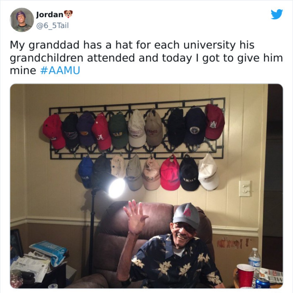19 university-educated grandchildren — now, that’s something else. And don’t forget, he might have more grandkids who haven’t made it to university yet. So, his wall of hats might keep growing and growing!