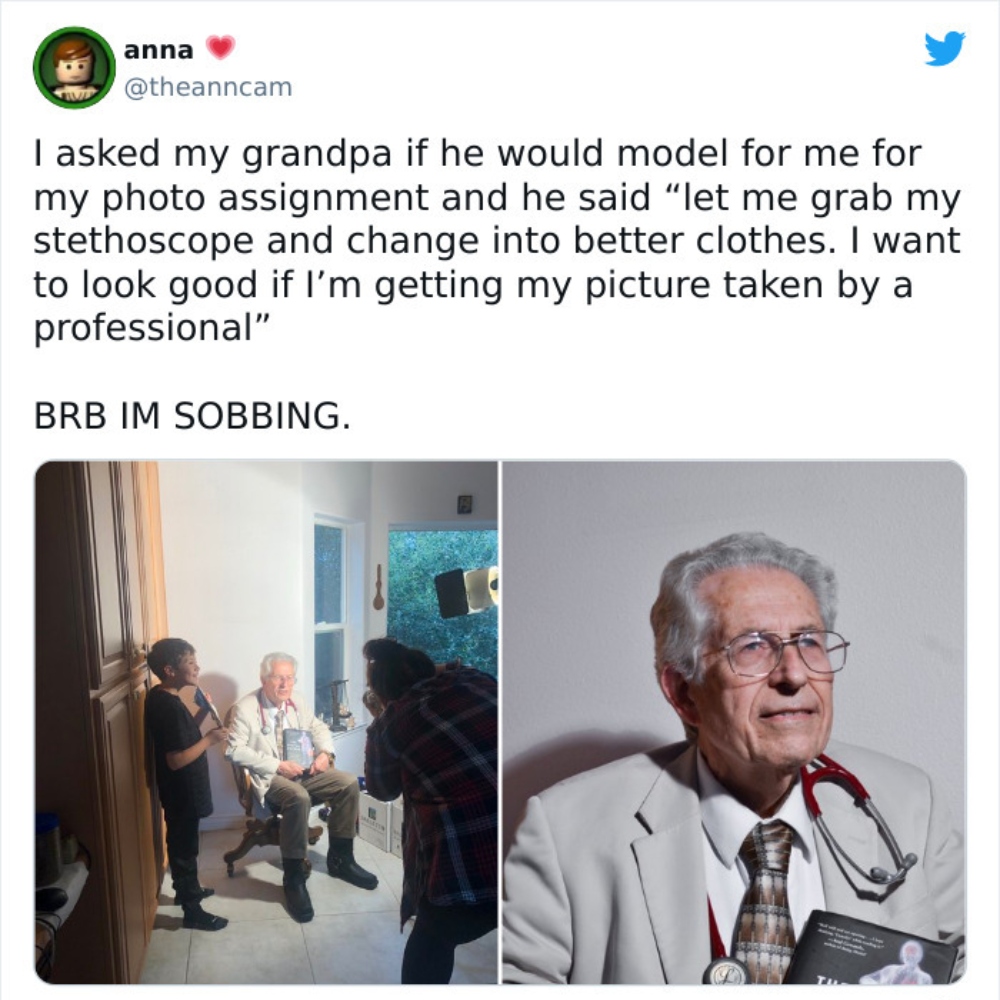 A photography student asked her grandfather if she could take a portrait of him for an assignment. And gramps didn’t just say yes, he said, “Let me just grab my stethoscope and change my clothes. I want to look good if I’m getting my picture taken by a professional.”