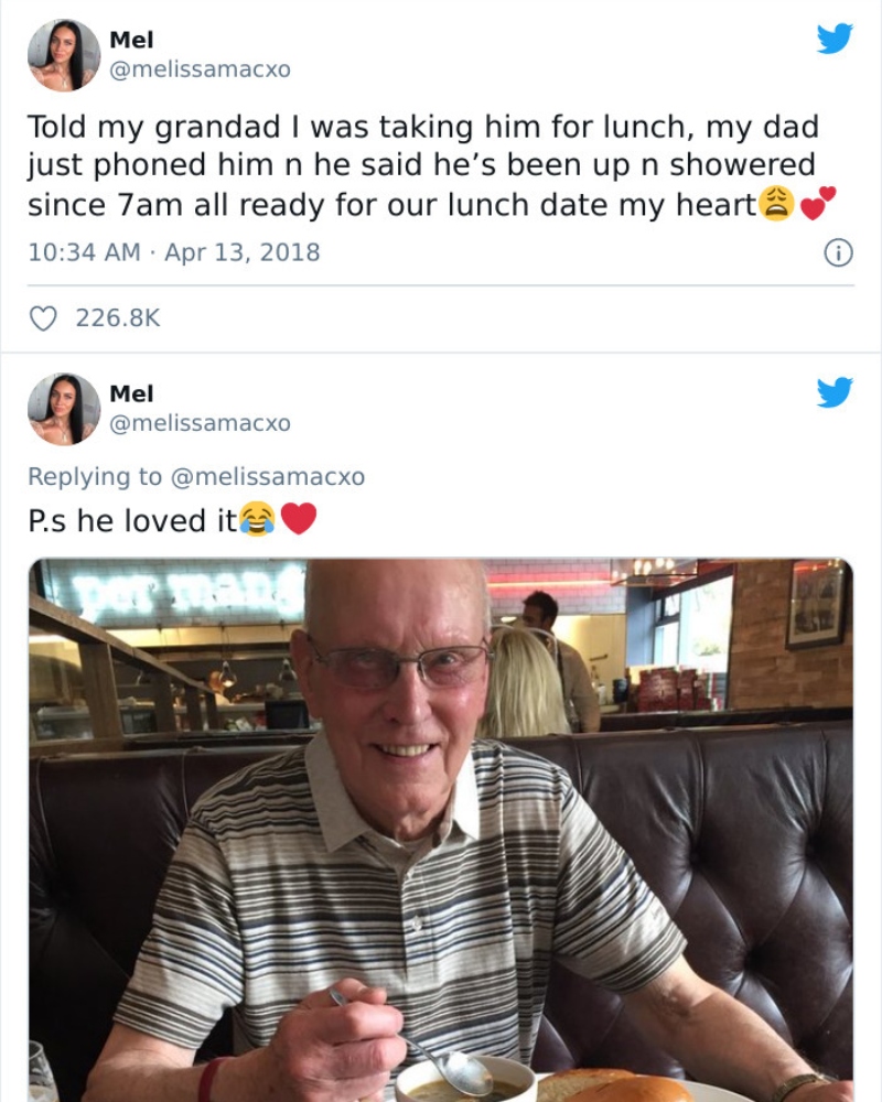 This granddad was over the moon that his granddaughter was taking him out for lunch. So much so, that when her dad phoned him, her grandpa proudly stated he had been up and showered since 7:00 am in preparation for his “date.”