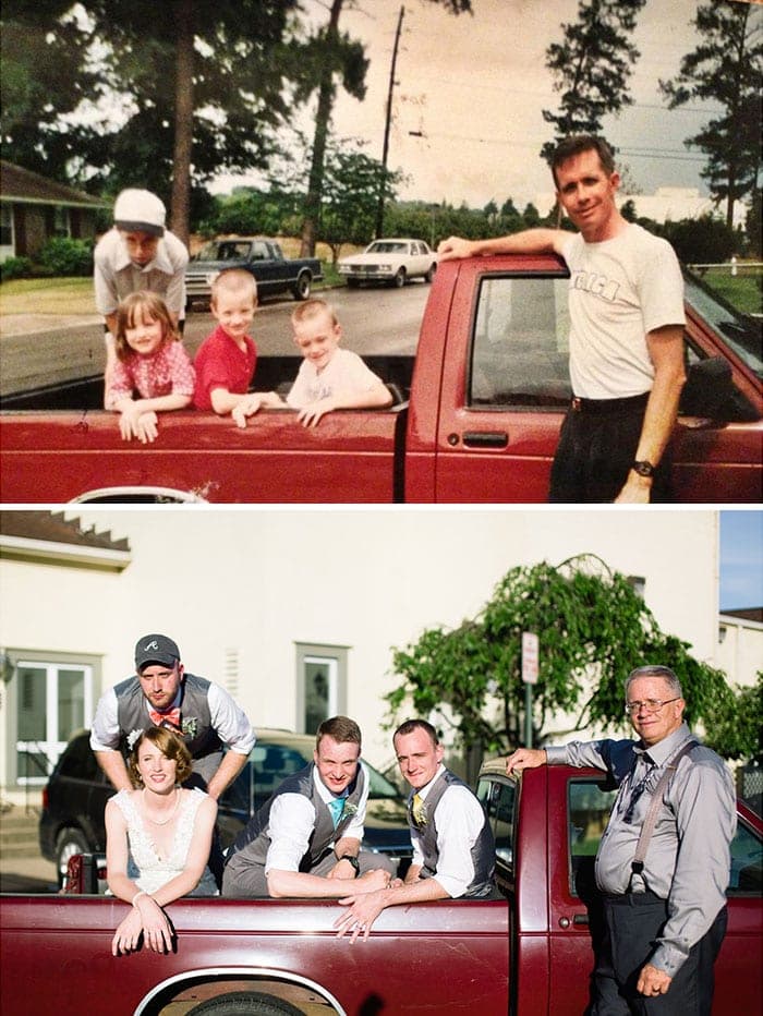 The annual trip to Disney World was always the Johnson family’s favorite vacation. For the kids, that is. As the for the parents, breaking up back seat arguments and putting up with overheated and starving children wasn’t the ideal getaway. But these are the sacrifices a parent must make, right? Now, in a slightly more modern van, the adult siblings climb into the back seats and embark on another nostalgic trip to Disney World. And what would the adventure be worth if a then and now photo wasn’t captured to document the moment?