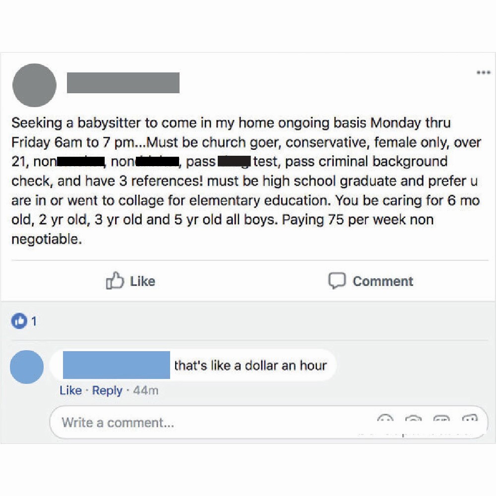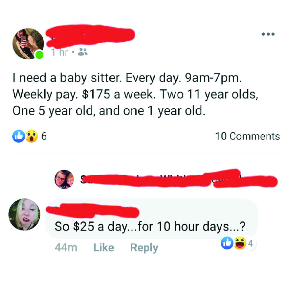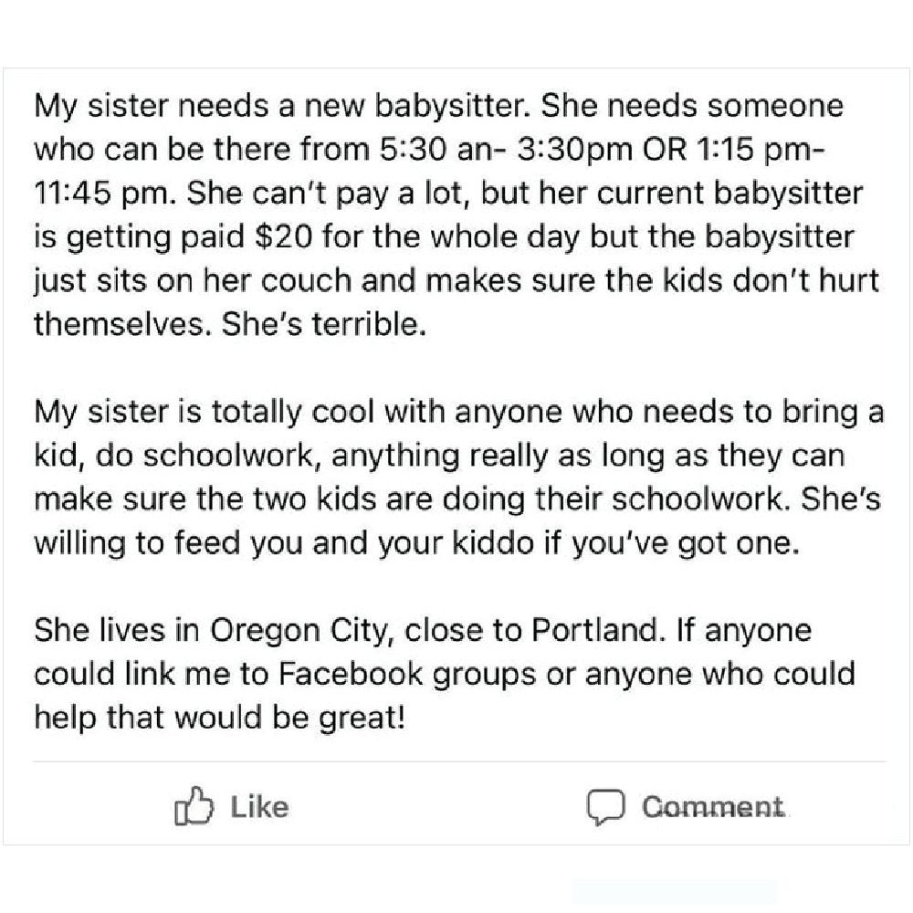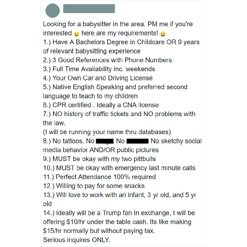 Combine that with the working hours (that haven’t been mentioned so it could be a 10-hour workday), and the rates are an actual joke. A babysitter could make less than two dollars. The poster of this advertisement is questionable too, stating a “babysitter” took the life of her first child.