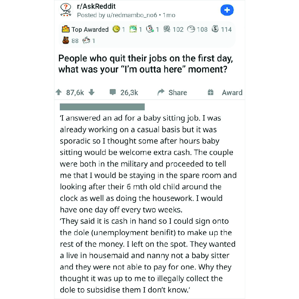 A military couple posted an advertisement and when a Redditor reached out to them, things got ugly. They told the babysitter that they were expected to look after their child around the clock. One holiday would be granted every two weeks and they would be paying “under the table” so the sitter could receive the money without tax payment.
